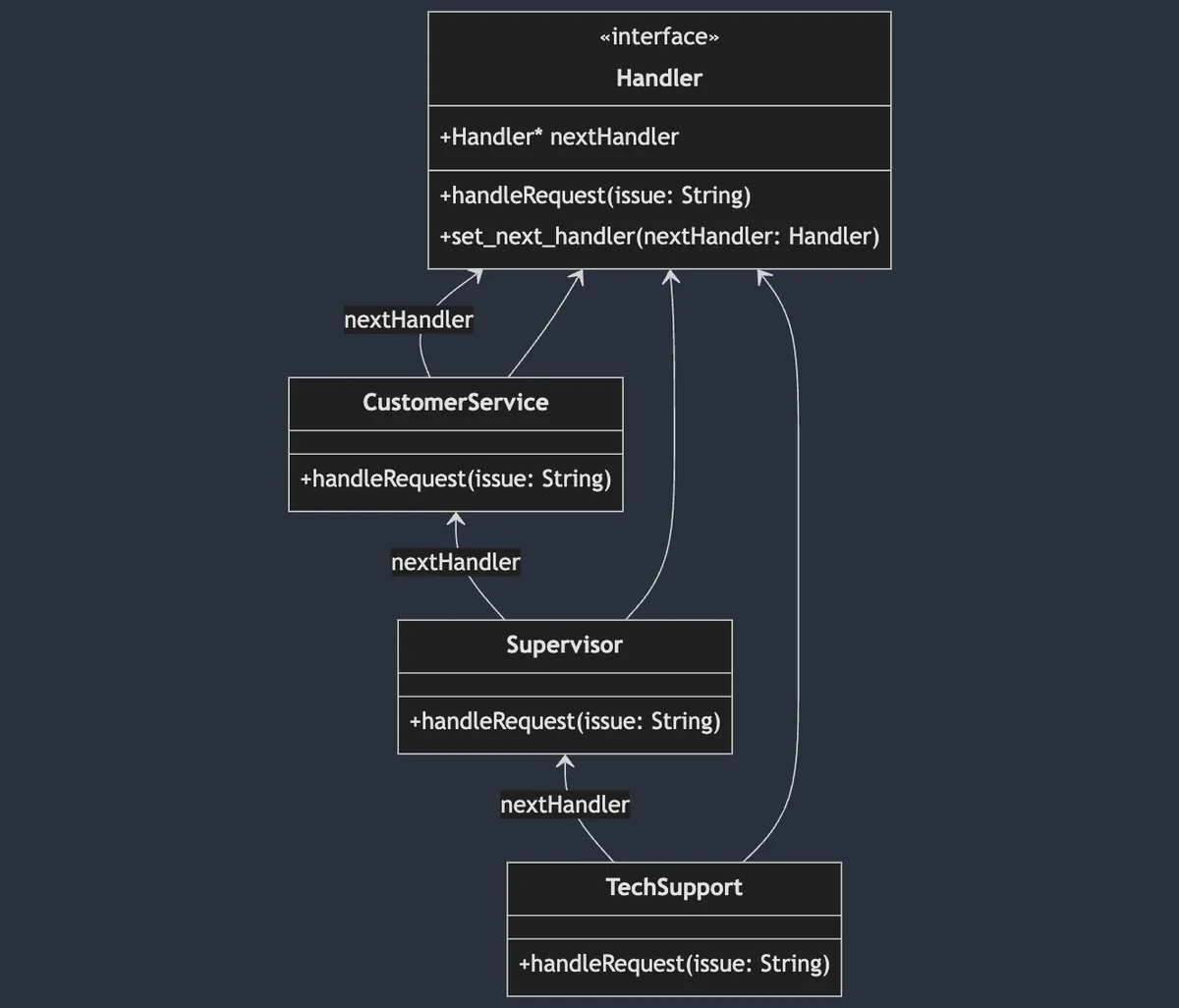 func handle()实现,如果有接下来处理则回传true否则回传falsefunc exeute()是预设的链访问实现,会从这边执行遍历整个操作链,预设行为是当func handle()为false(代表此节点无法处理) 则自动呼叫下一个nextHandler的execute()继续处理,直到结束。