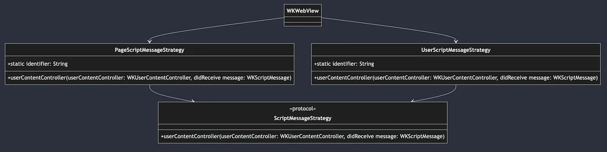 系统已经有定义好的 Protocol 跟相应的 func add(_ scriptMessageHandler: any WKScriptMessageHandler, name: String) 方法,我们只需要定义好自己的 WKScriptMessageHandler 实现,并加入到 WKWebView,系统就会依照 Strategy Pattern 策略模式,根据收到的 name 派发给对应的 具体策略 执行。