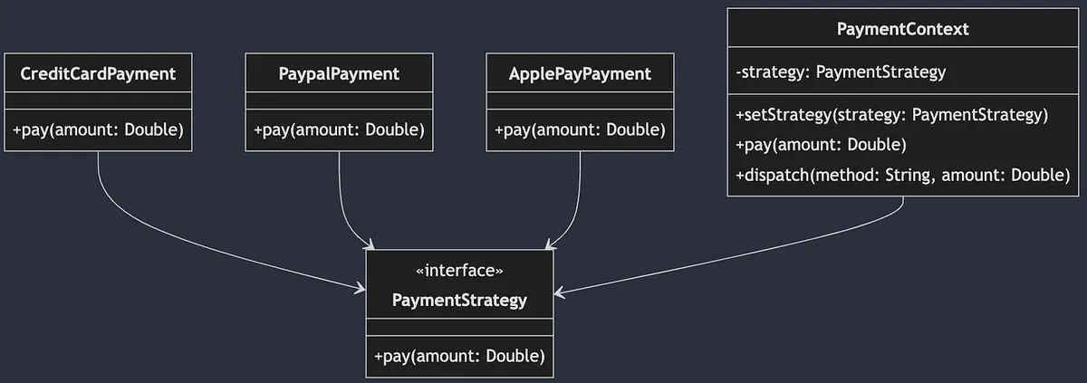 上图以不同支付方式为例,我们把支付抽象为 Payment Protocol (Interface),然后各种支付方式去实现自己的实作,在 PaymentContext (模拟外部使用)时 依据使用者选择的付款方式,产生对应的 Payment 实体并统一呼叫 pay() 进行支付。