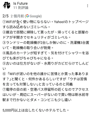 这次住到雷: 日本找饭店也还是要看评价,最好直接看低分评价的内容,看能不能接受、再打开街景实际走看看好不好走