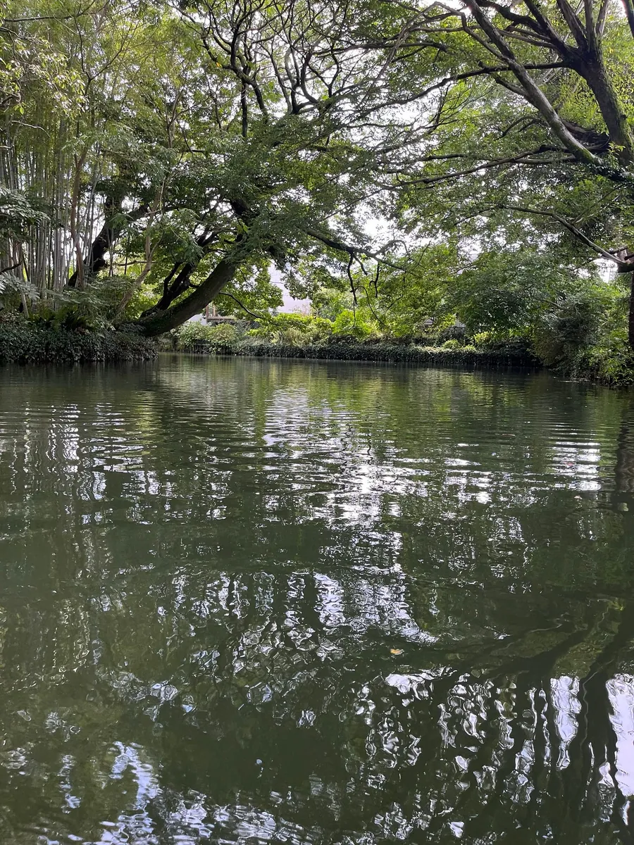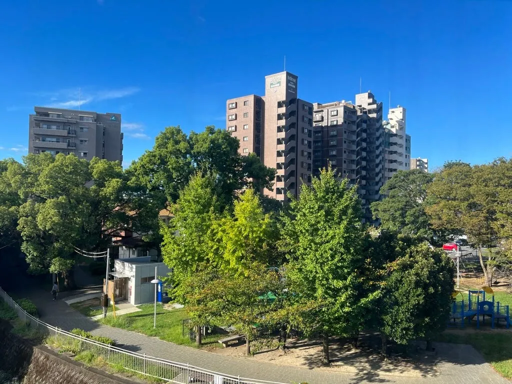 回饭店后第一次掀开窗帘,后面就是水前寺流域;其实风景不错,晚上听得到虫鸣。