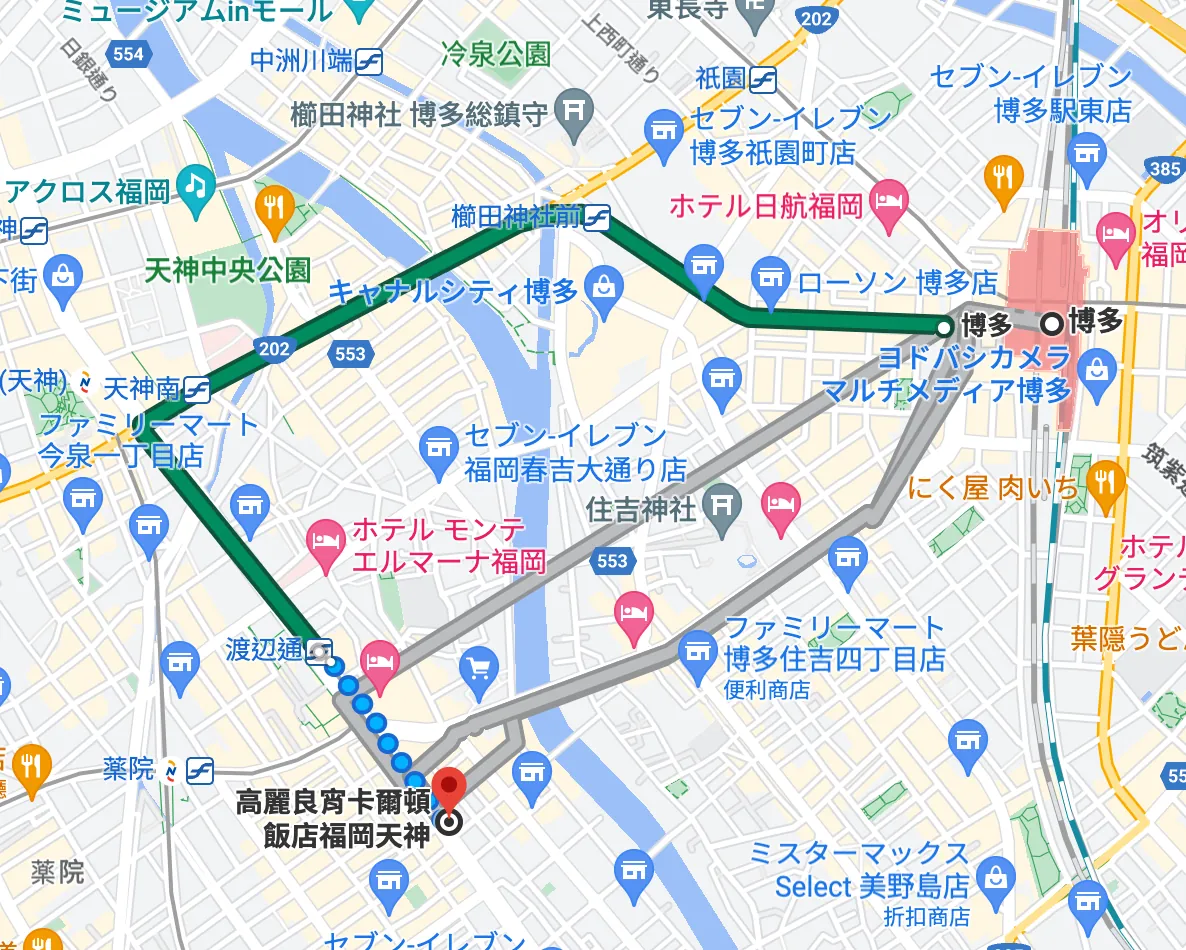 搭地铁到博多太绕,直接走路到渡边通搭公车到博多比较快。