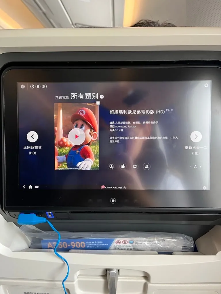 回程的飞机比较新,电影有超级玛利欧兄弟,看完刚好到台湾;位子也没坐满,爽爽的一人坐一整排!