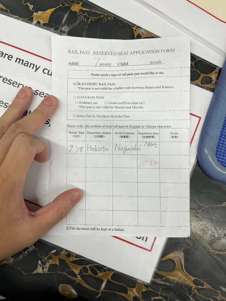到博多后先去人工柜台兑换 JR Pass (出示护照)并预约前往长崎的位子,兑换 JR Pass 的外国人很多,大概排了快一小时才排到,建议提早出门或提前去换。