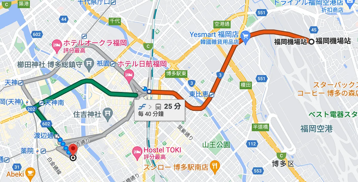 本来预计要搭的是 2 号直达博多站,但 2 号好像末班还是要再等一个小时(我忘了),就改搭 1 号到福冈空港国内线(地下铁福冈机场站),再搭地铁到博多再转地下铁七隈线到渡边通站。