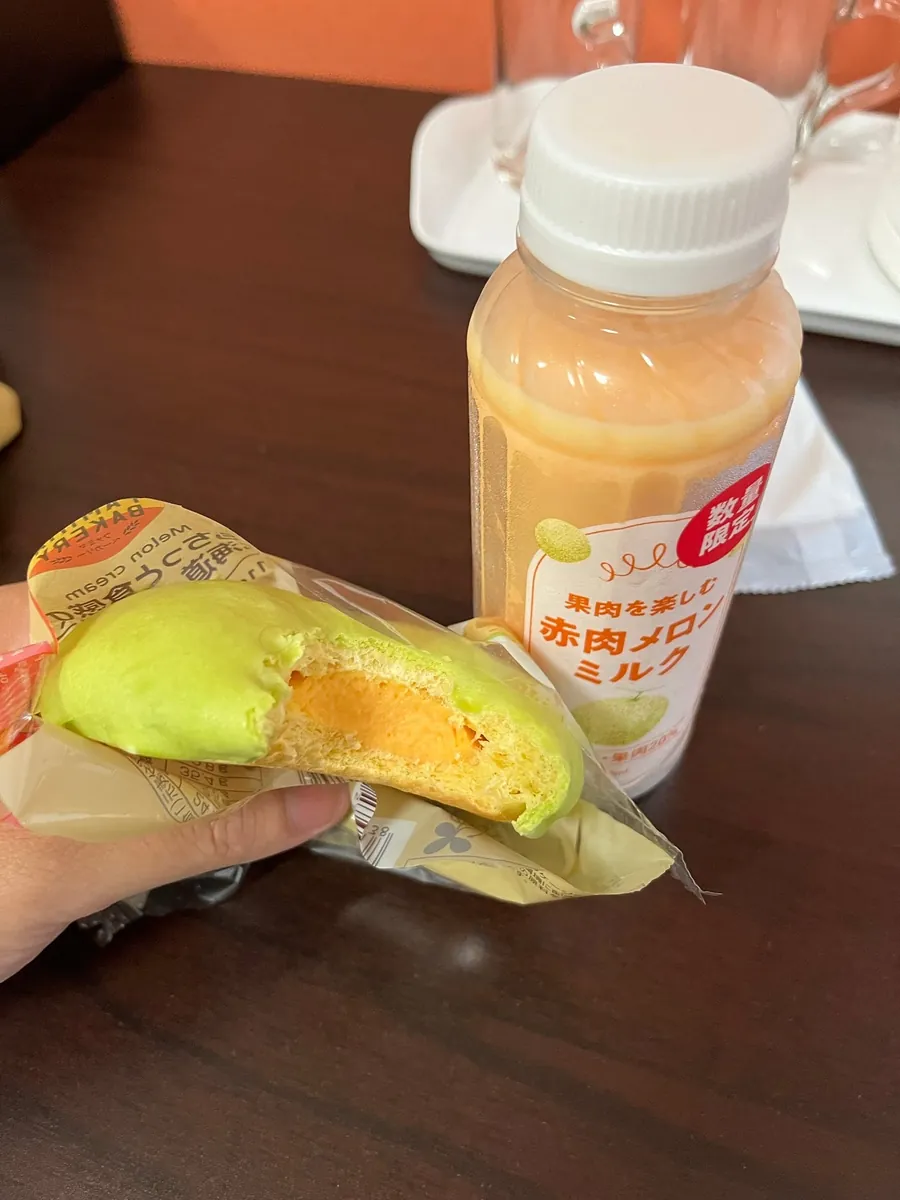 也顺手买明天早上的早餐(哈密瓜面包+果汁),全家的这款果肉果汁(哈密瓜、草莓…)真的好喝,我几乎有看到就会买来喝,里面有果肉甜甜的很好喝。