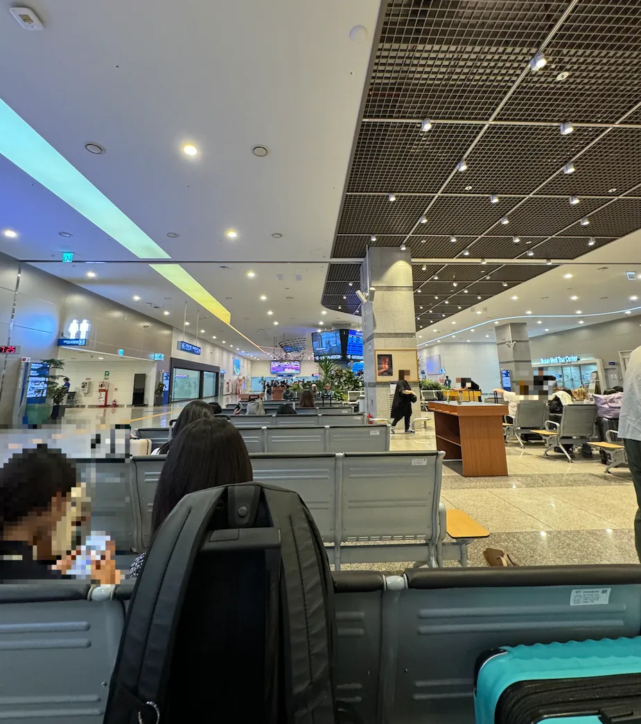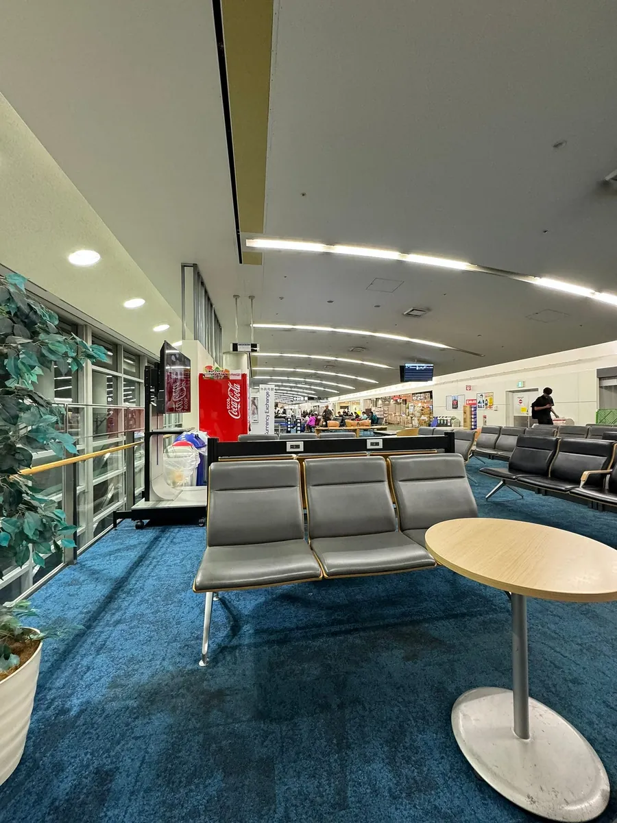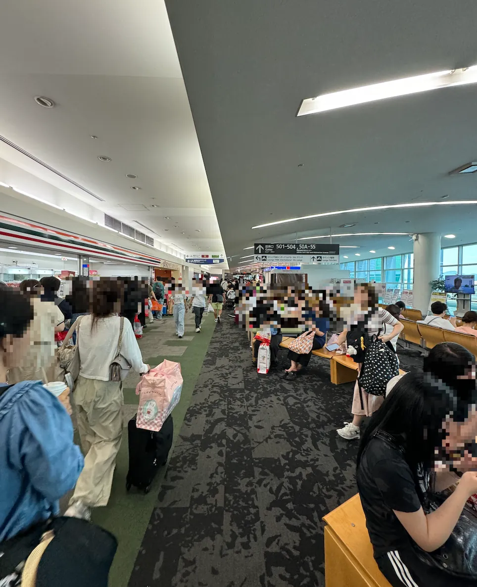 福冈机场出境的候机厅是狭长型的,人很多很多,非常混乱拥挤。(不知道是不是因为还在整修跟太多航班等待起飞的关系)。