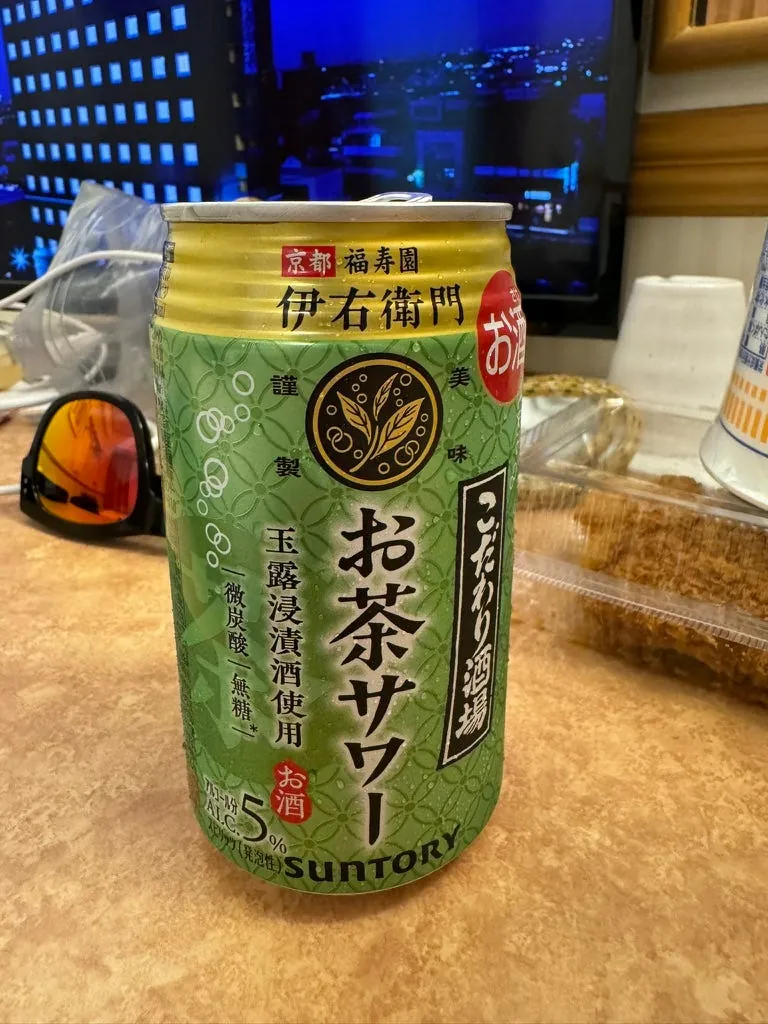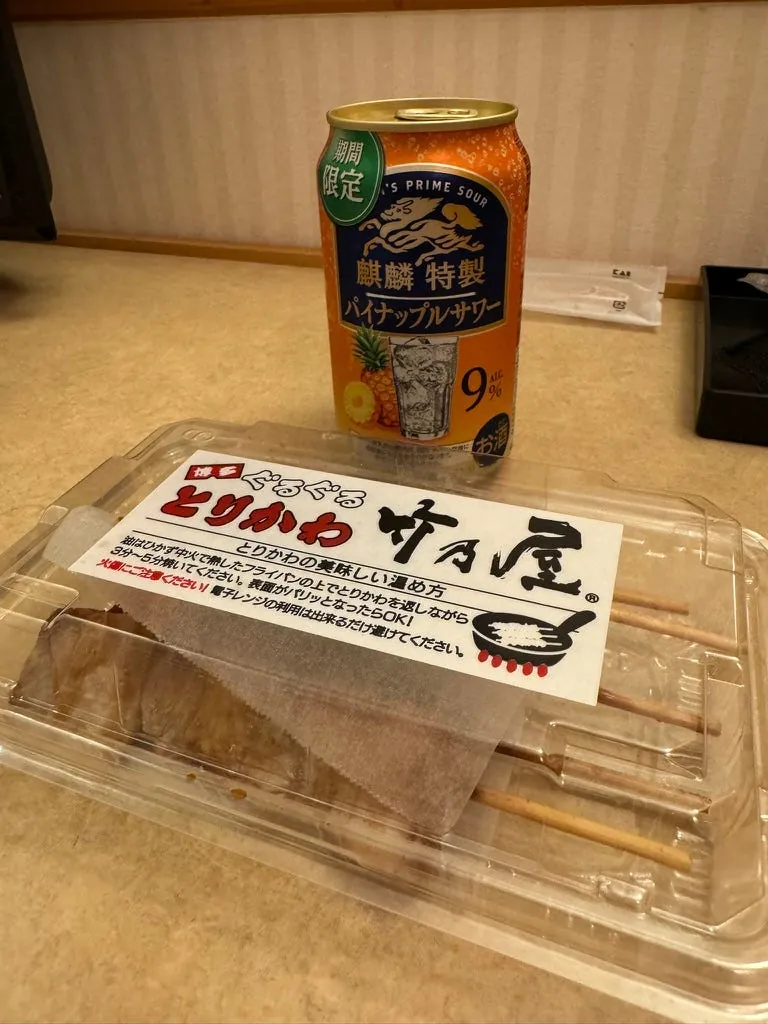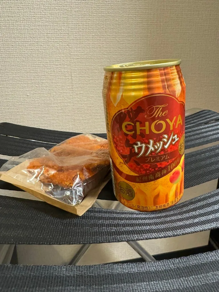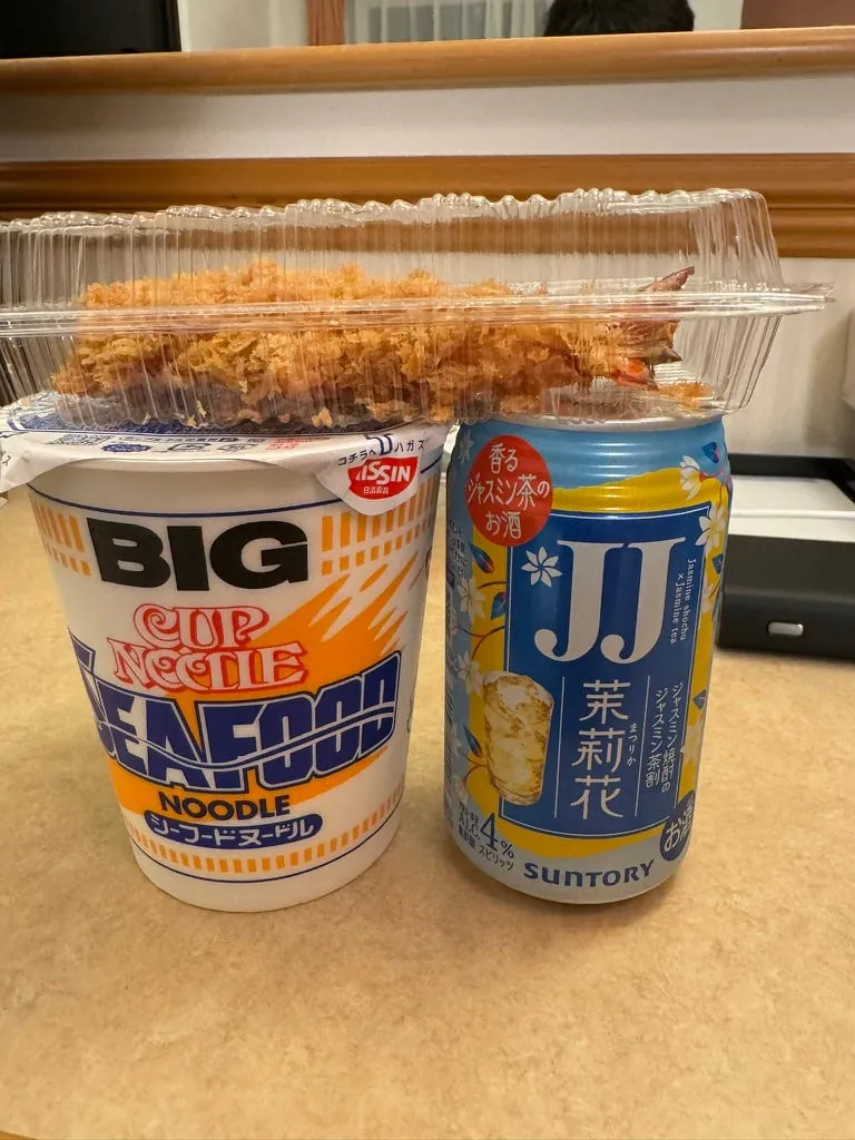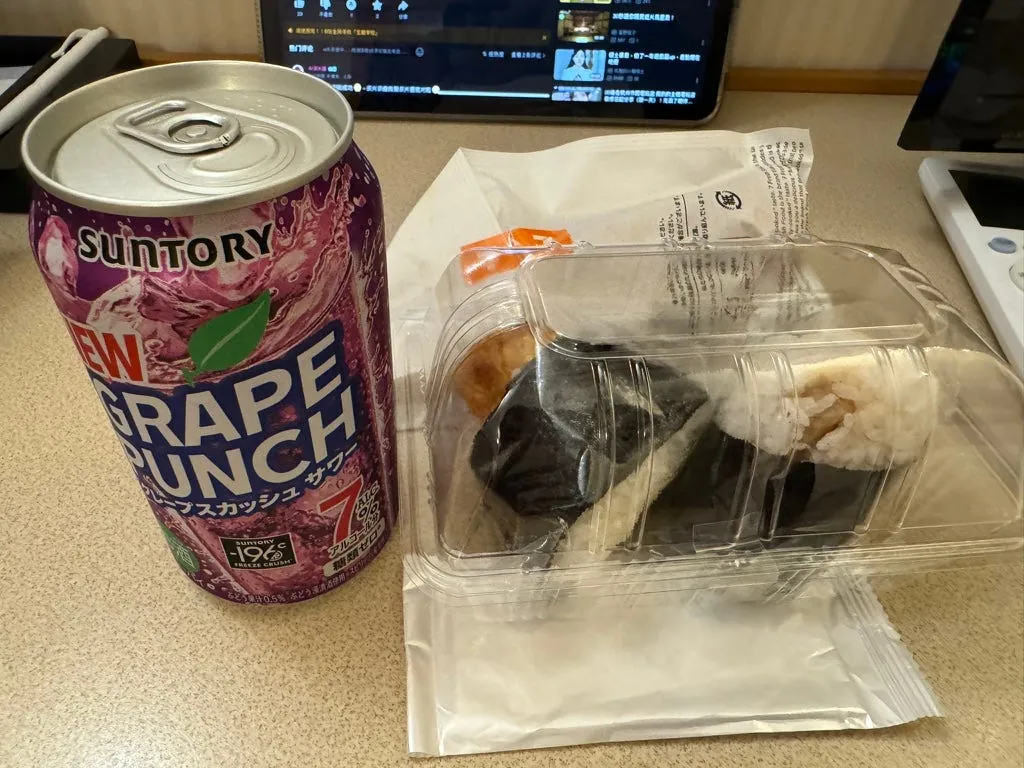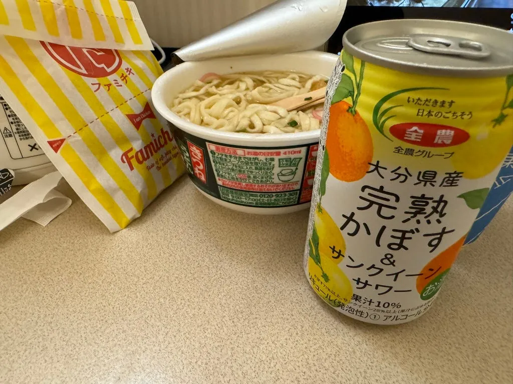 宵夜,日清咚兵卫豆皮泡面(这次来那么多天才第一次吃)、大分产的水果酒、超商鸡油炸鸡(Juicy 好吃)。