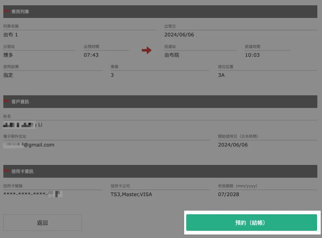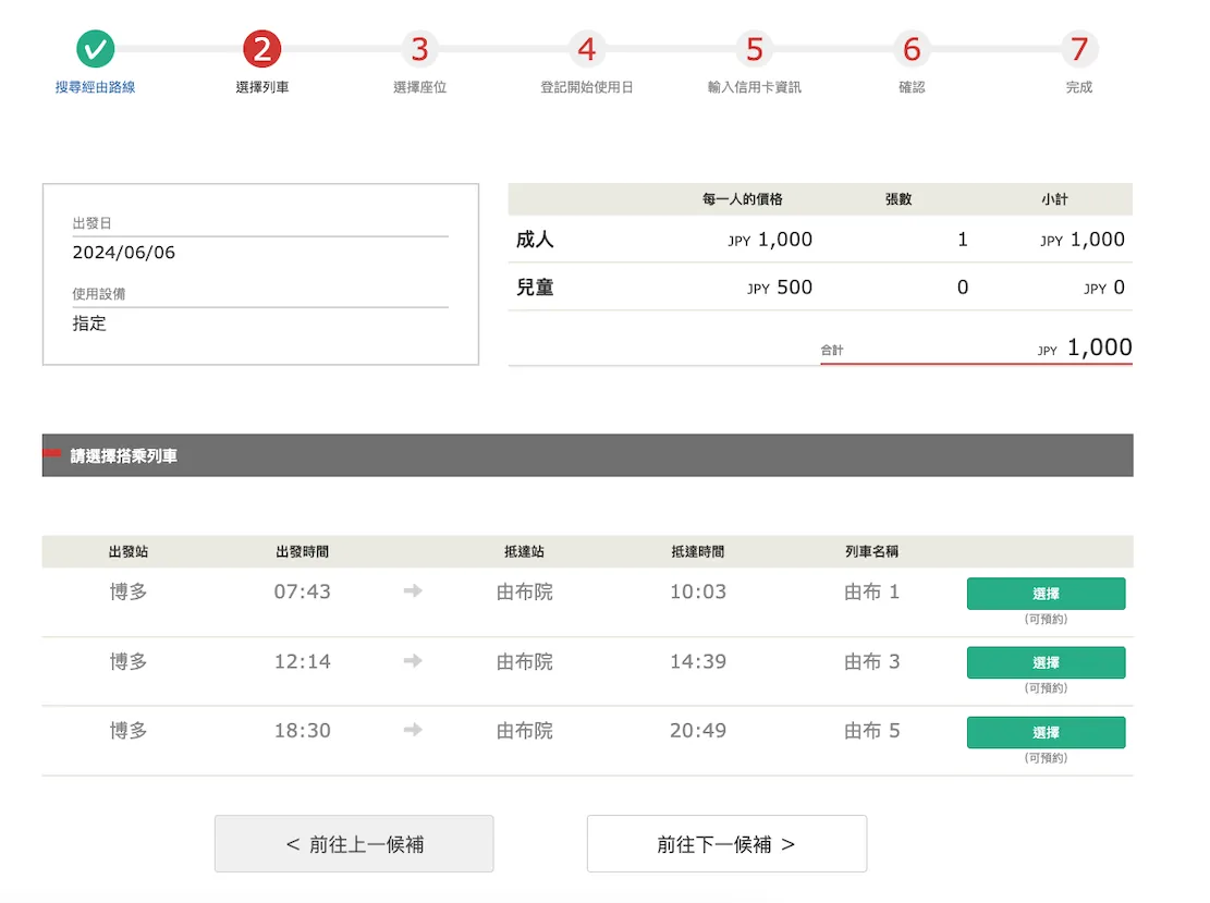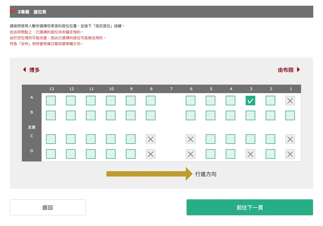 由 布院之森 博多往由布院没预定到,只能预定 由布 1 的位子。