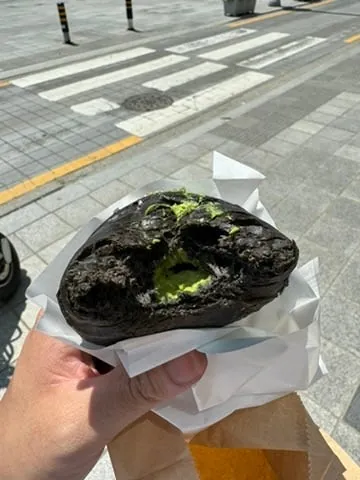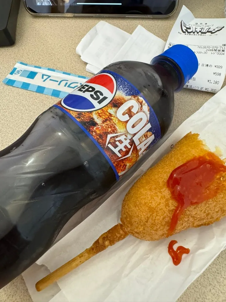 提著战利品回饭店休息,吃个热狗跟甜品还有 日本必喝!生可乐!