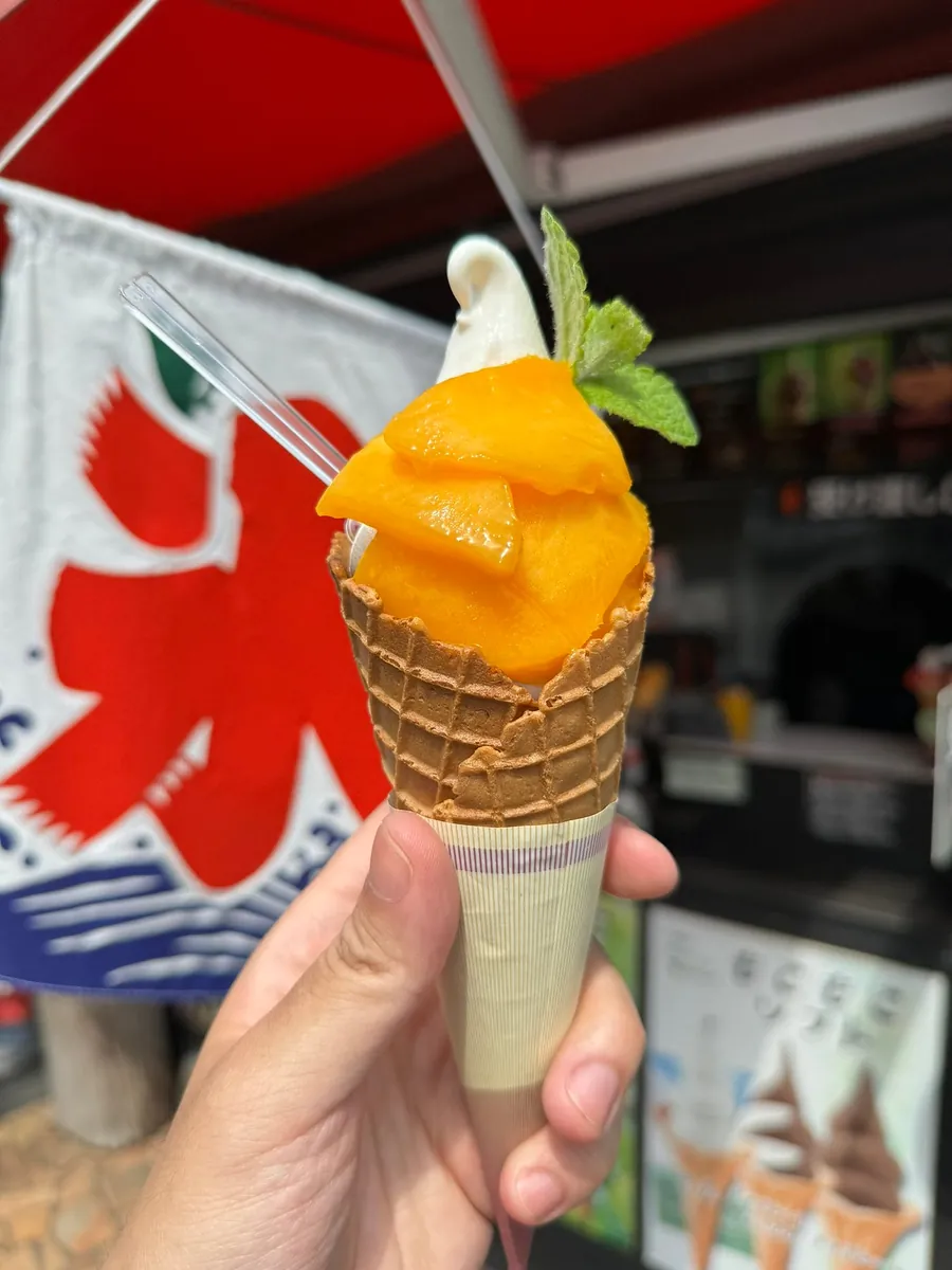 大家都在这排队满冰淇淋,也一起尝试了宫崎本地芒果冰淇淋(900 日圆),导游说宫崎芒果很高级,不过老实说还是台湾的芒果比较有芒果味。
