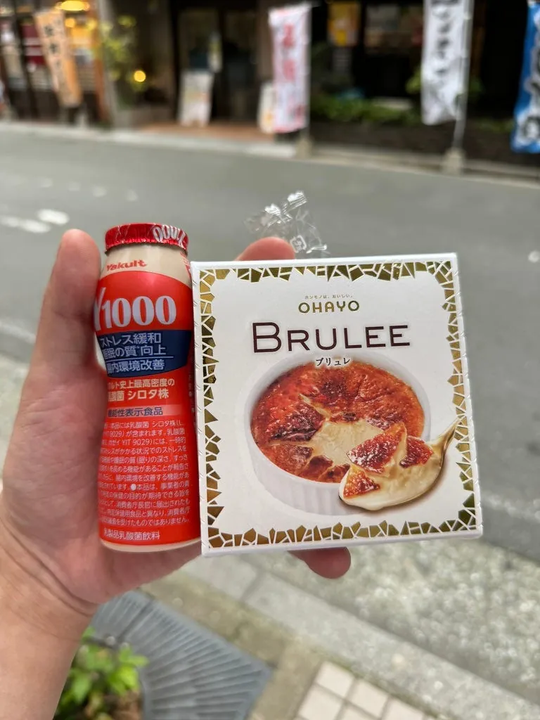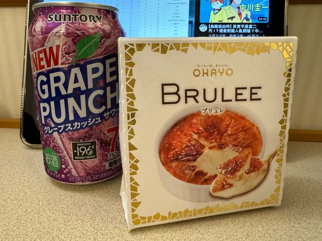 晚餐随便买了超商热狗、前几天 Day 6 有吃过的天神地下街饭团,新的葡萄口味 Suntory 好喝!!点心再嗑了一个 BRULEE。