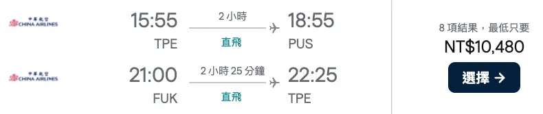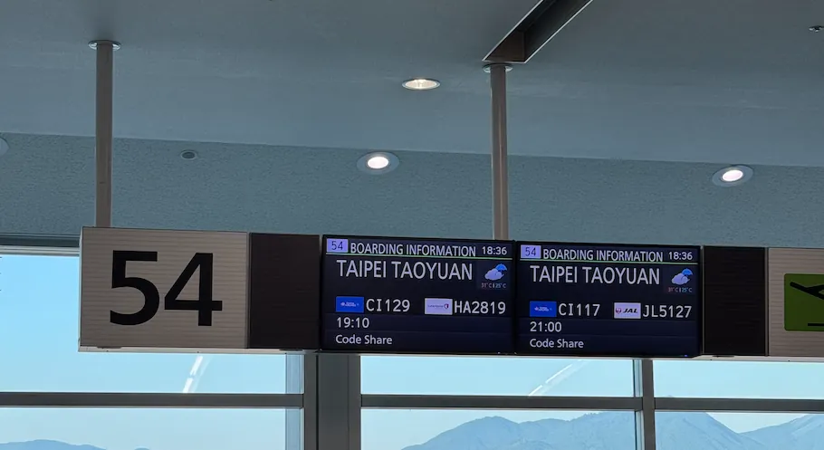 回程:华航 日本福冈机场 FUK 21:00 -> 台北桃园 TPE 22:25