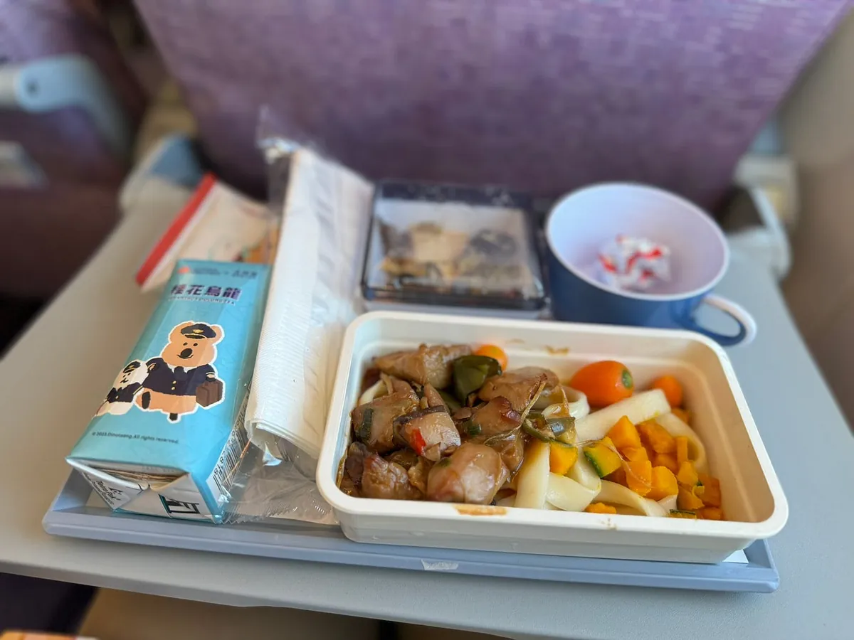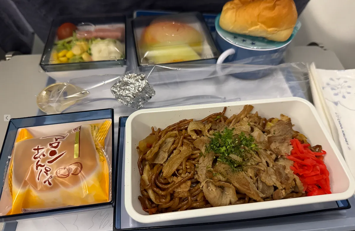 再见九州、再见日本,飞机餐是姜味猪肉炒面,不怎么样,但水果有哈密瓜!