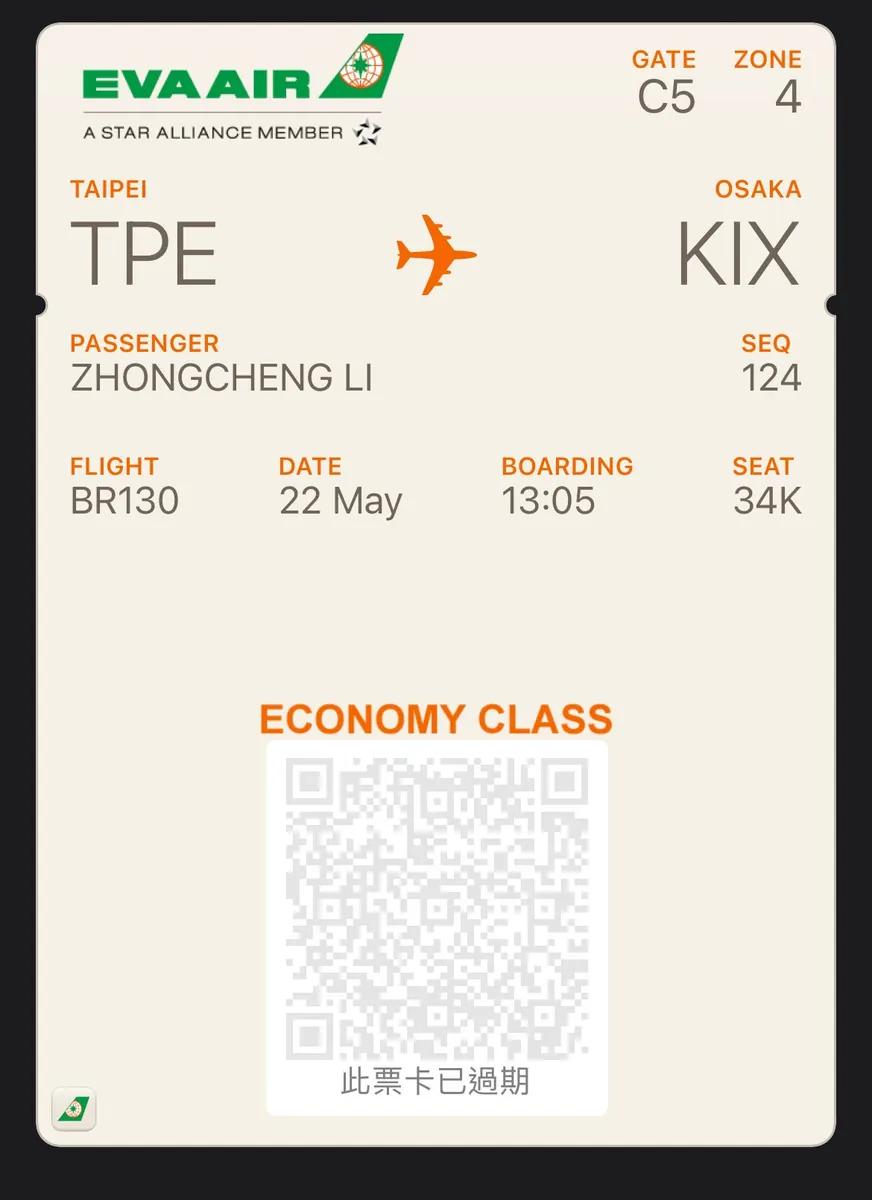 长荣 BR 13013:35 TPE -> KIX 17:15 (实际延误 1 小时多,18:40 才到日本)5/29