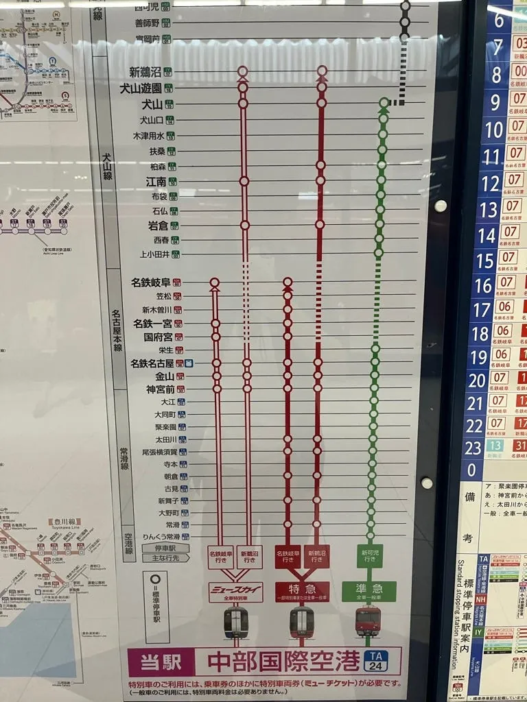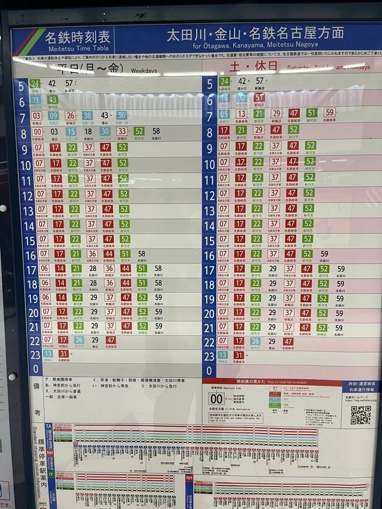 不过如果要省钱跟方便,其实现场买准急或是直接进站搭普通车就可以了;附上列车时刻表及停留站,或直接从 名铁网站查询 :