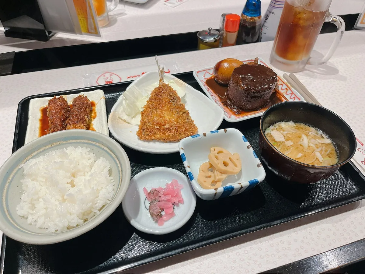 无脑的点套餐吃,想想点错了,主要是想吃左上角的味噌猪排,套餐是 味噌猪排+炸柳叶鱼+佃煮+小菜+汤+饭;味噌猪排好吃但太少吃不够啊!