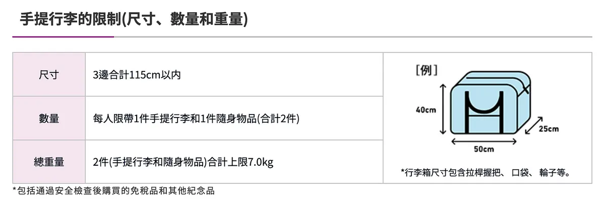 手提行李规定: 每人两件 & 总重小于 7 公斤