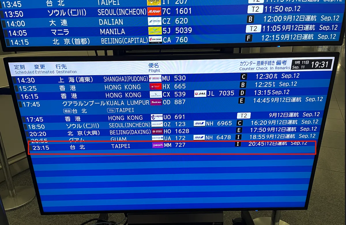 9/12 AM 00:09 — 中部国际机场第一航厦 起飞