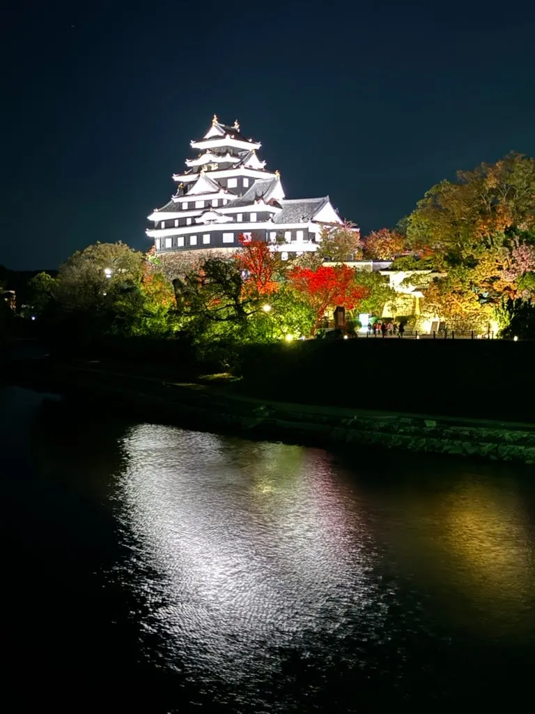 冈山城以「乌城」闻名(外观偏黑),夜间点灯与周边枫叶的搭配很有气氛。