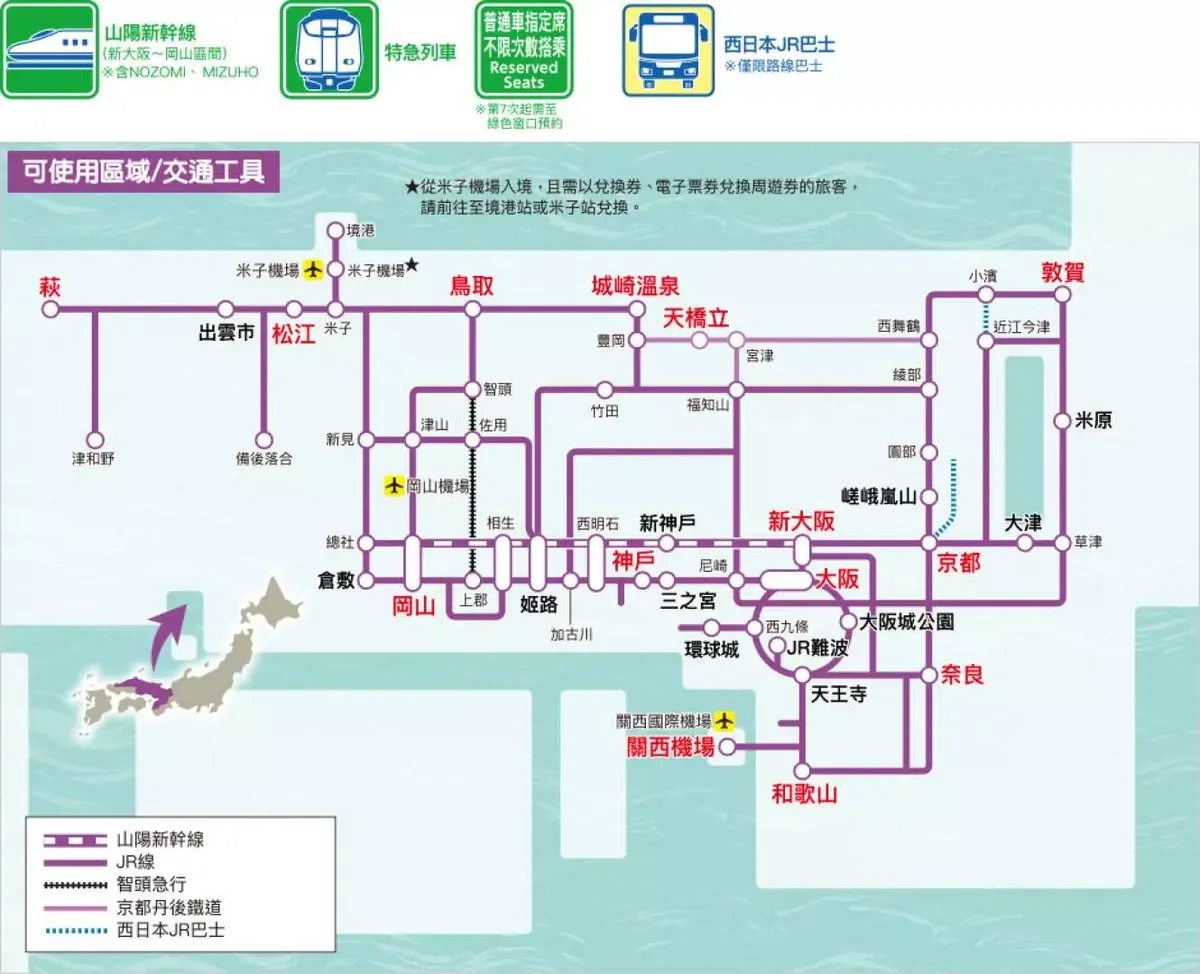 关西&山阴地区铁路周游券 JRPass (冈山机场进出最佳选择)
