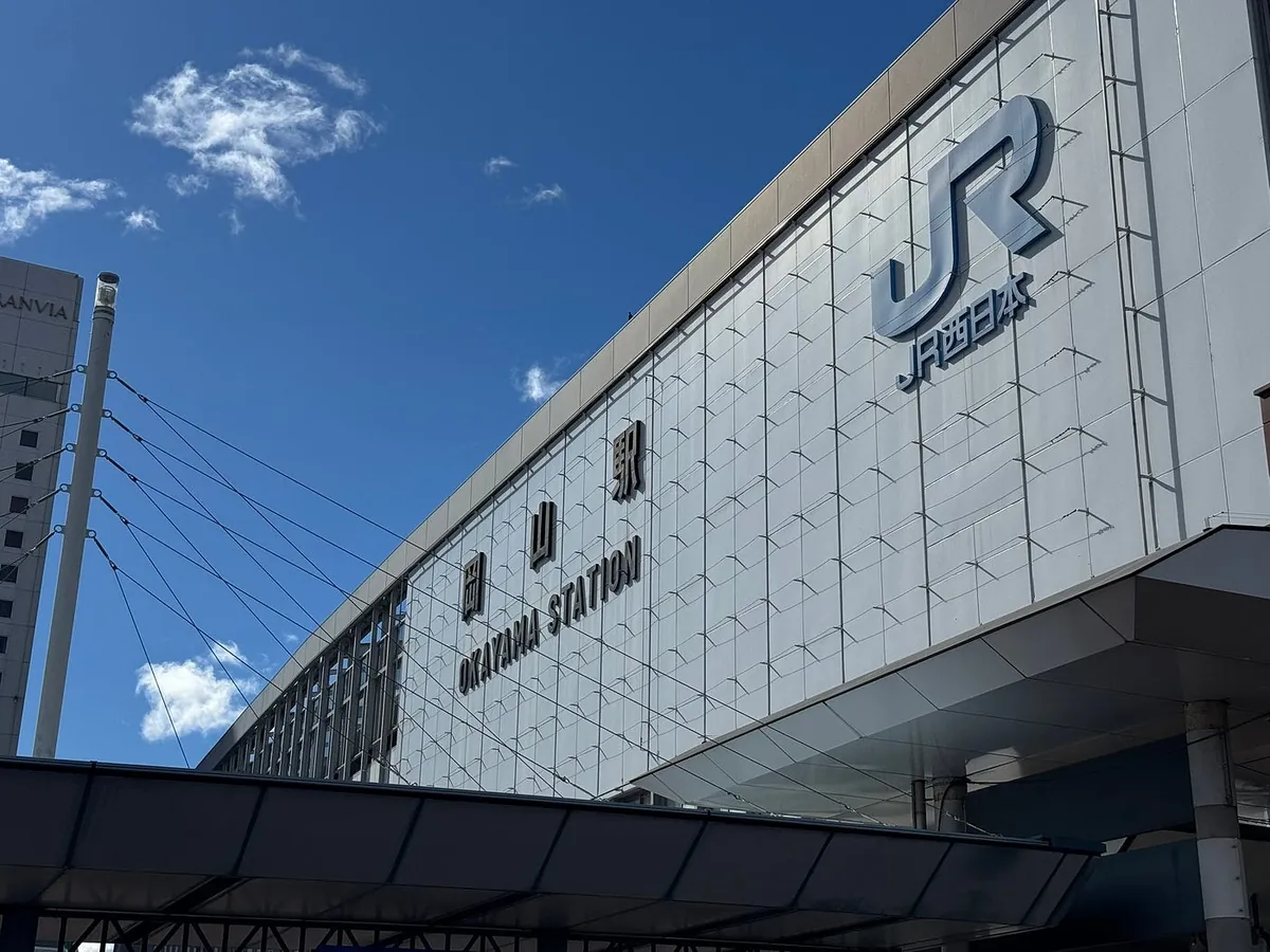 施工中的冈山站跟暂时被移到车站旁的桃太郎。
