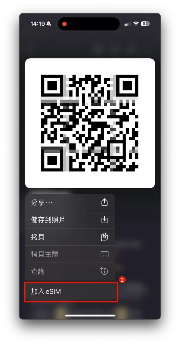 找到 eSIM 开通信,直接长按 QRCode 选择 加入 eSIM 即可。