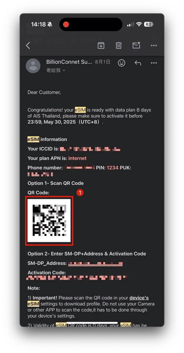 直接上 KKday 买 泰国网卡|AIS 5G高速网路 8日 无限流量+通话 eSIM ,买完直接收到 eSIM 启用凭证,就能使用了。