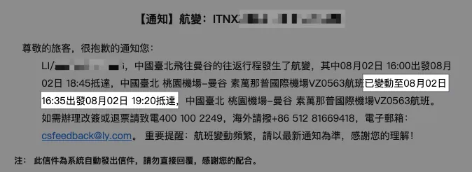 8/1 晚上 11 点多收到航变通知信,时程改成 16:35 出发,19:20 抵达。