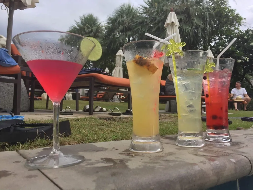 饭店是 Villa 形式,每间都是独栋,游泳池可以环绕整个饭店的每间房间,泳池旁就有酒吧;外面沙滩是未开发地区,一片荒芜。