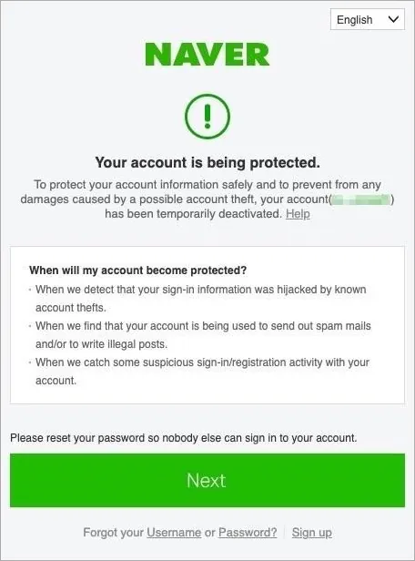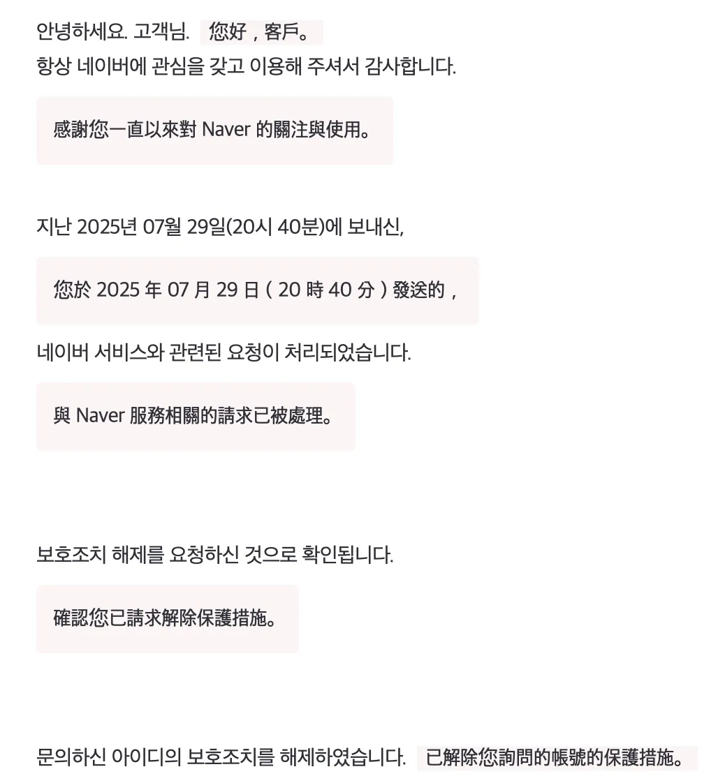 原因疑似是在台湾登入被认为是可疑活动触发 Naver 帐号保护机制。