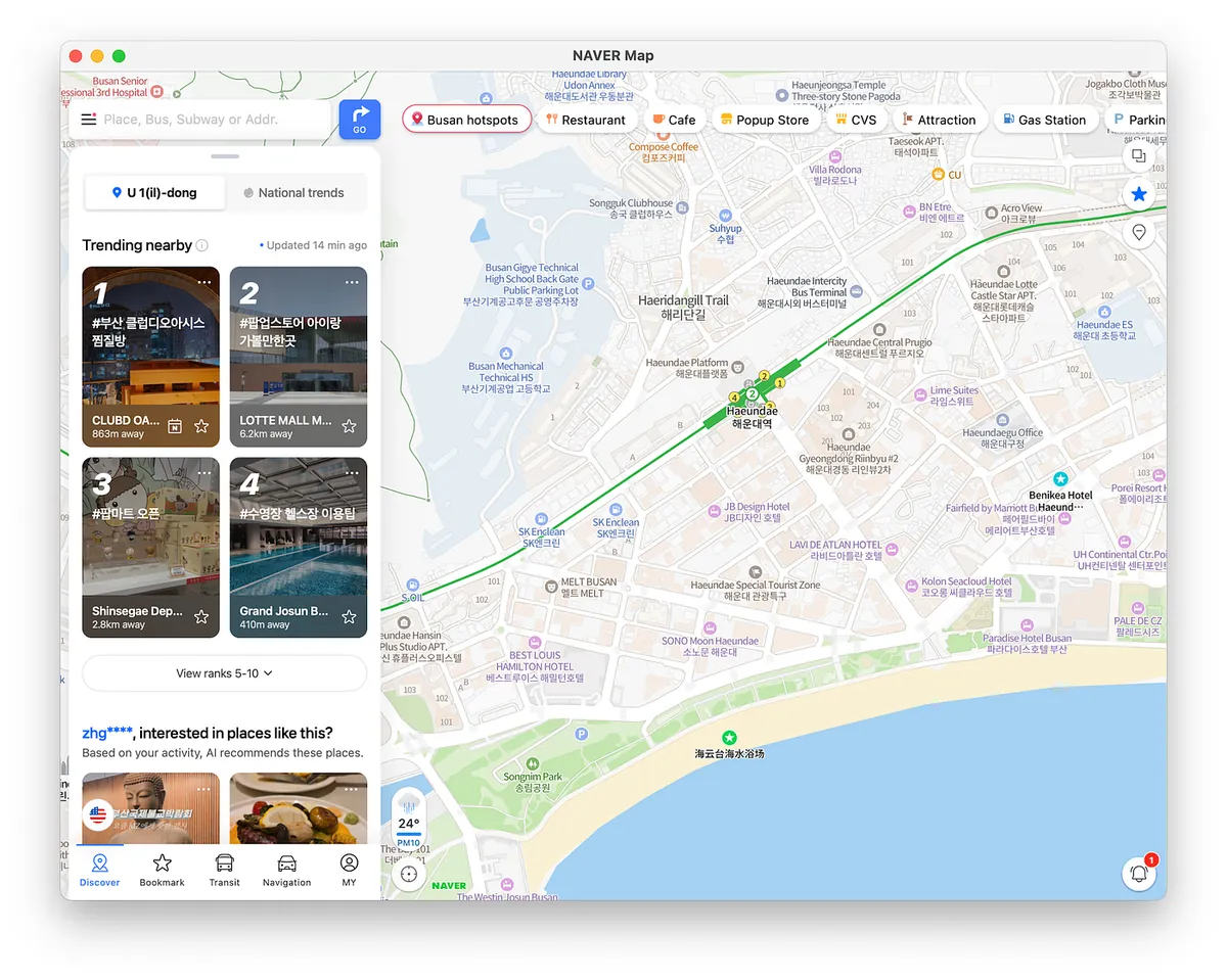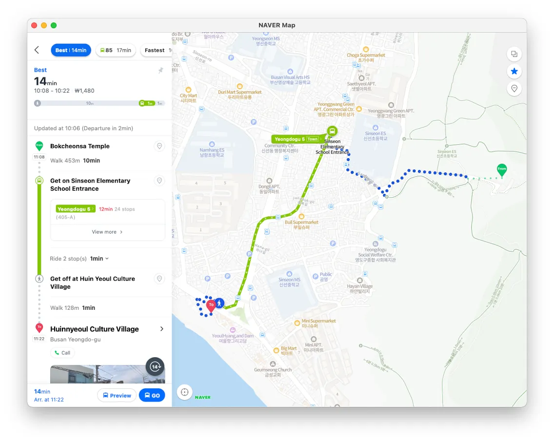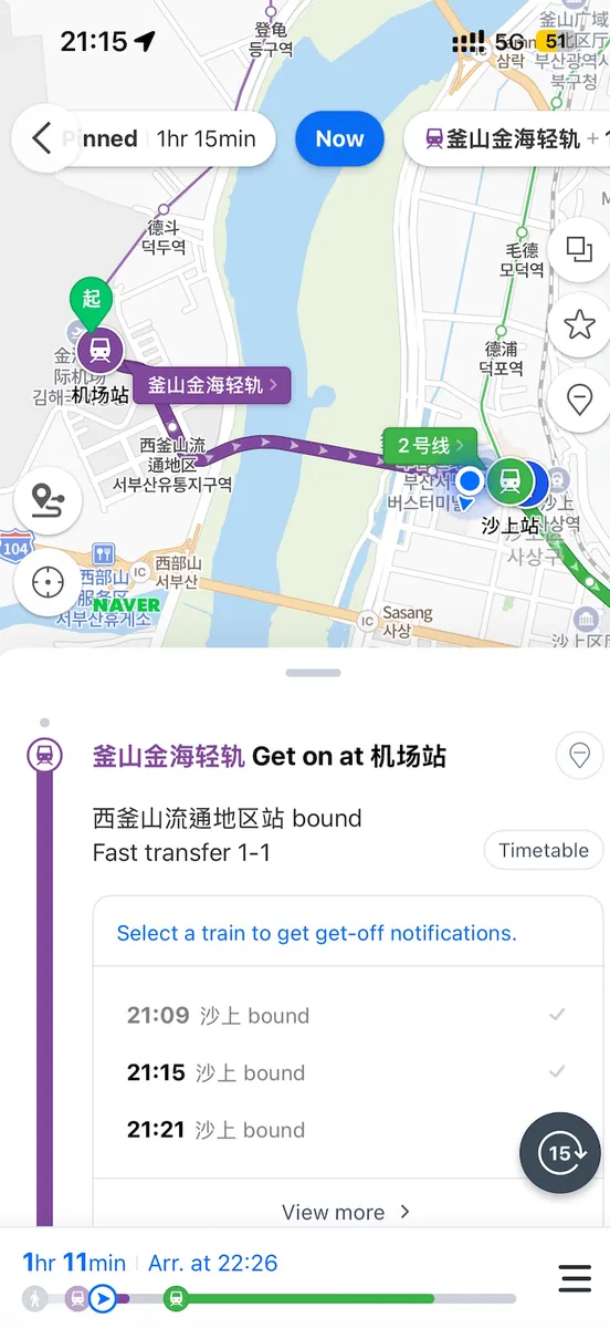 不管是哪一种都建议行前先在台湾用信用卡(因为有可能只支援某些发卡机构)先加值好或是携带一些现金到韩国用机台加值。 Naver Map