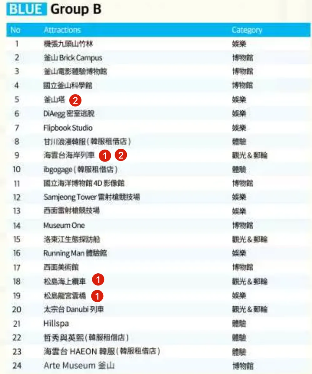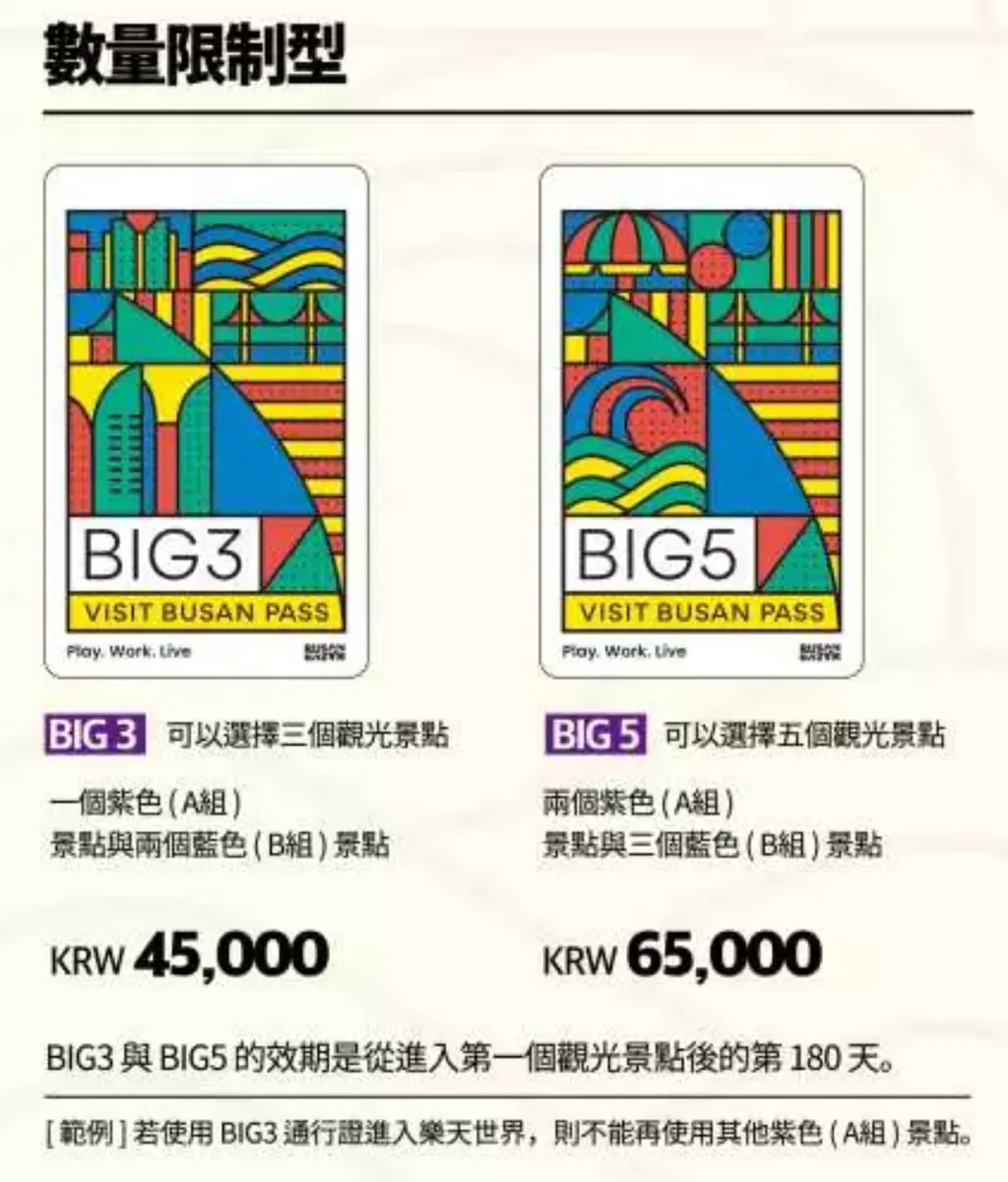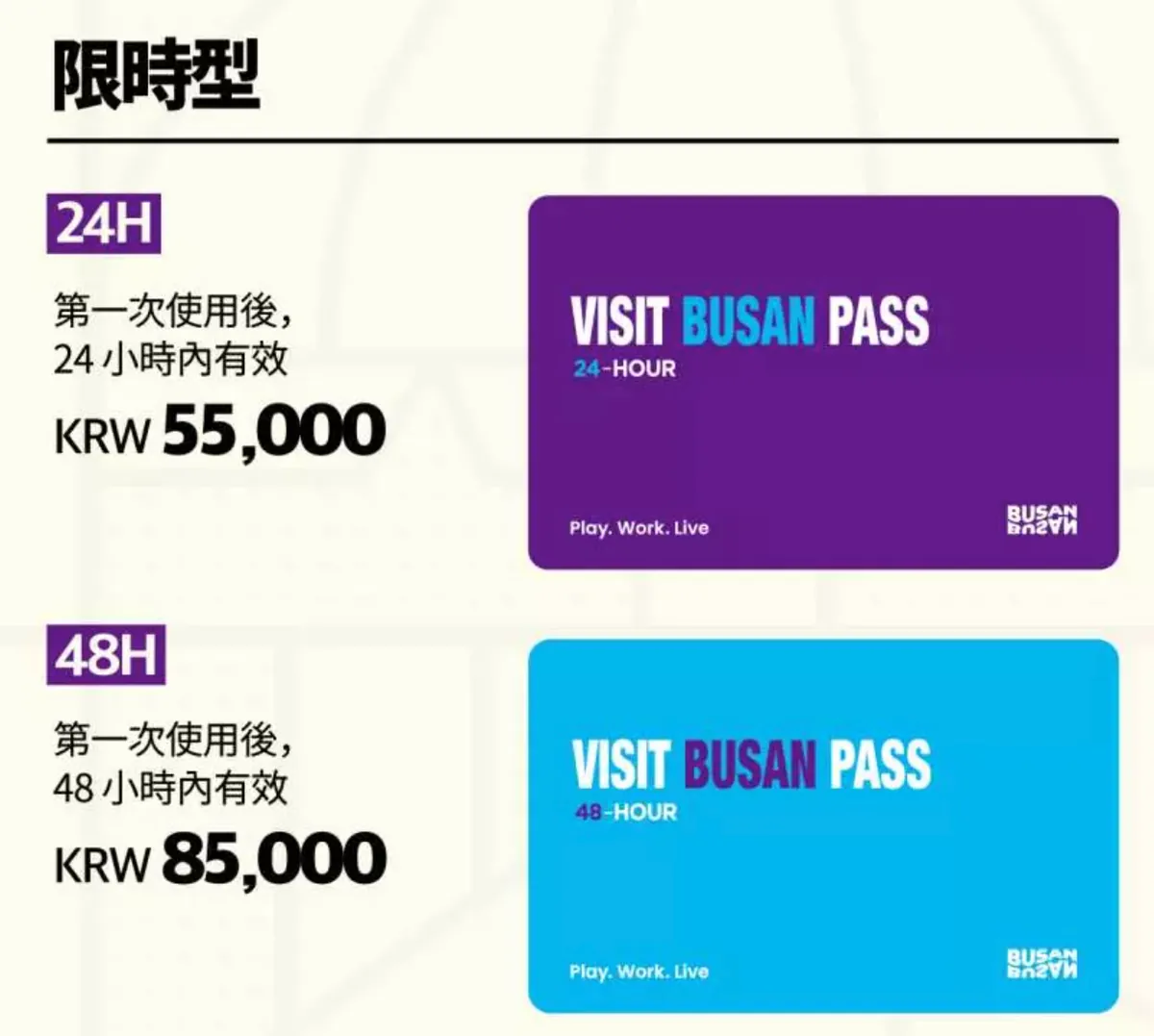Busan Pass 有分限时(24/48 HR)无限量型跟限制次数型(180天内用完)。