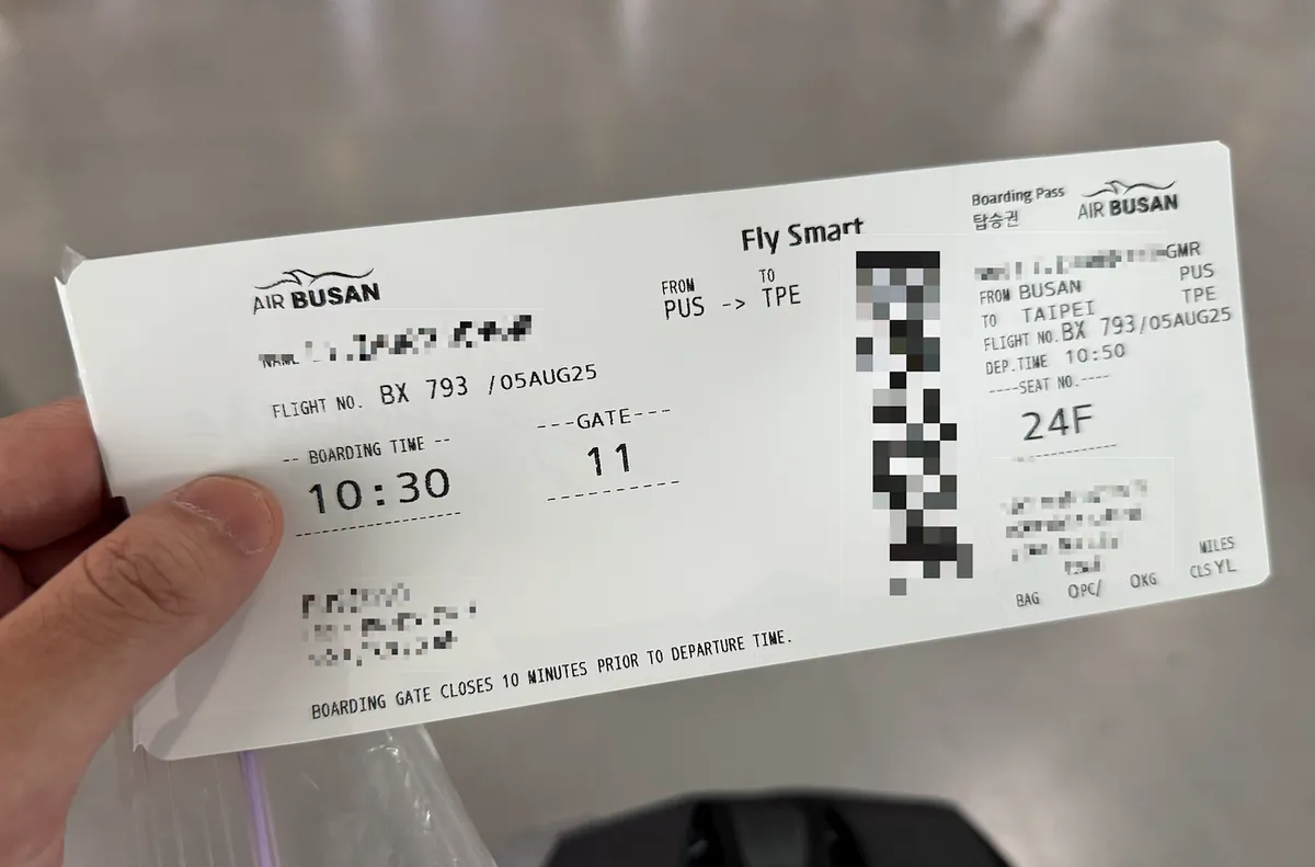 回程:08/05(二) 釜山金海(PUS) 10:50 -> 台北桃园(TPE) 12:35
