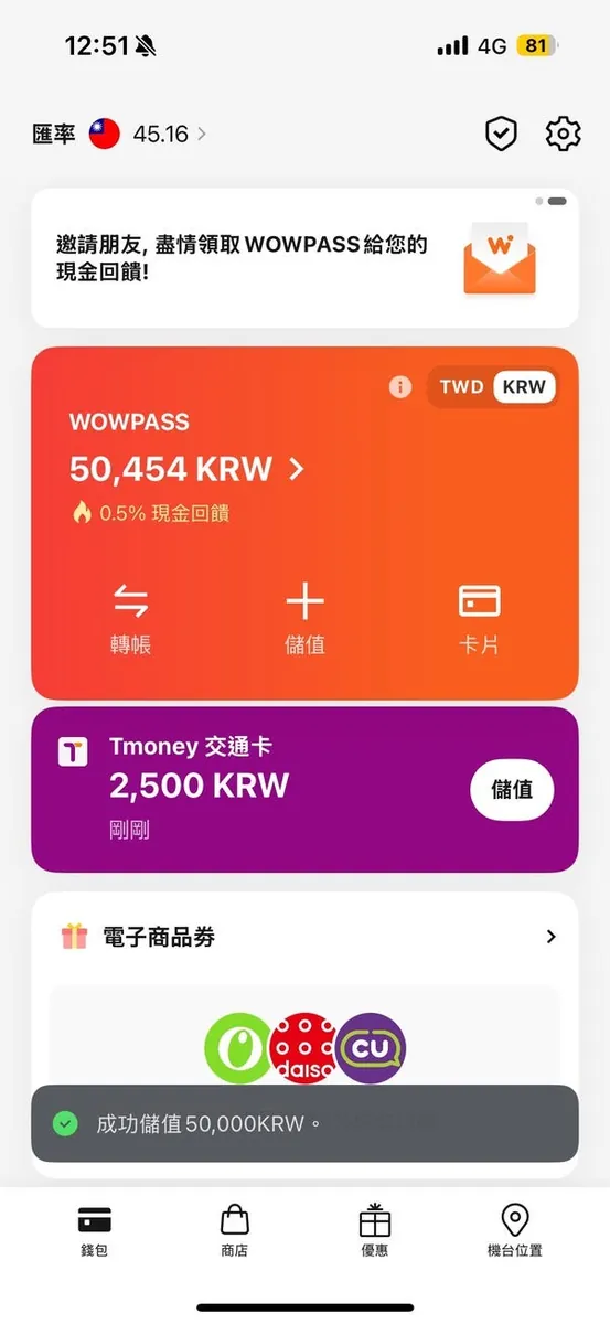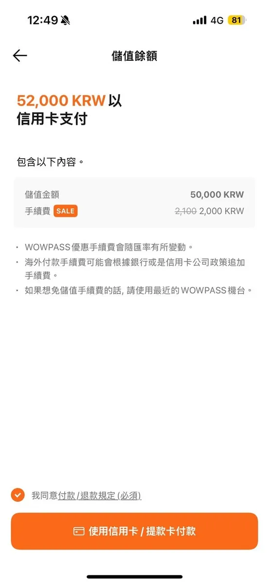 另外今年开始也能直接透过 Wowpass App 加值交通卡,流程是先用信用卡储值 Wowpass 再从 Wowpass 入金到 Tmoney,流程较多而且需要支付手续费。