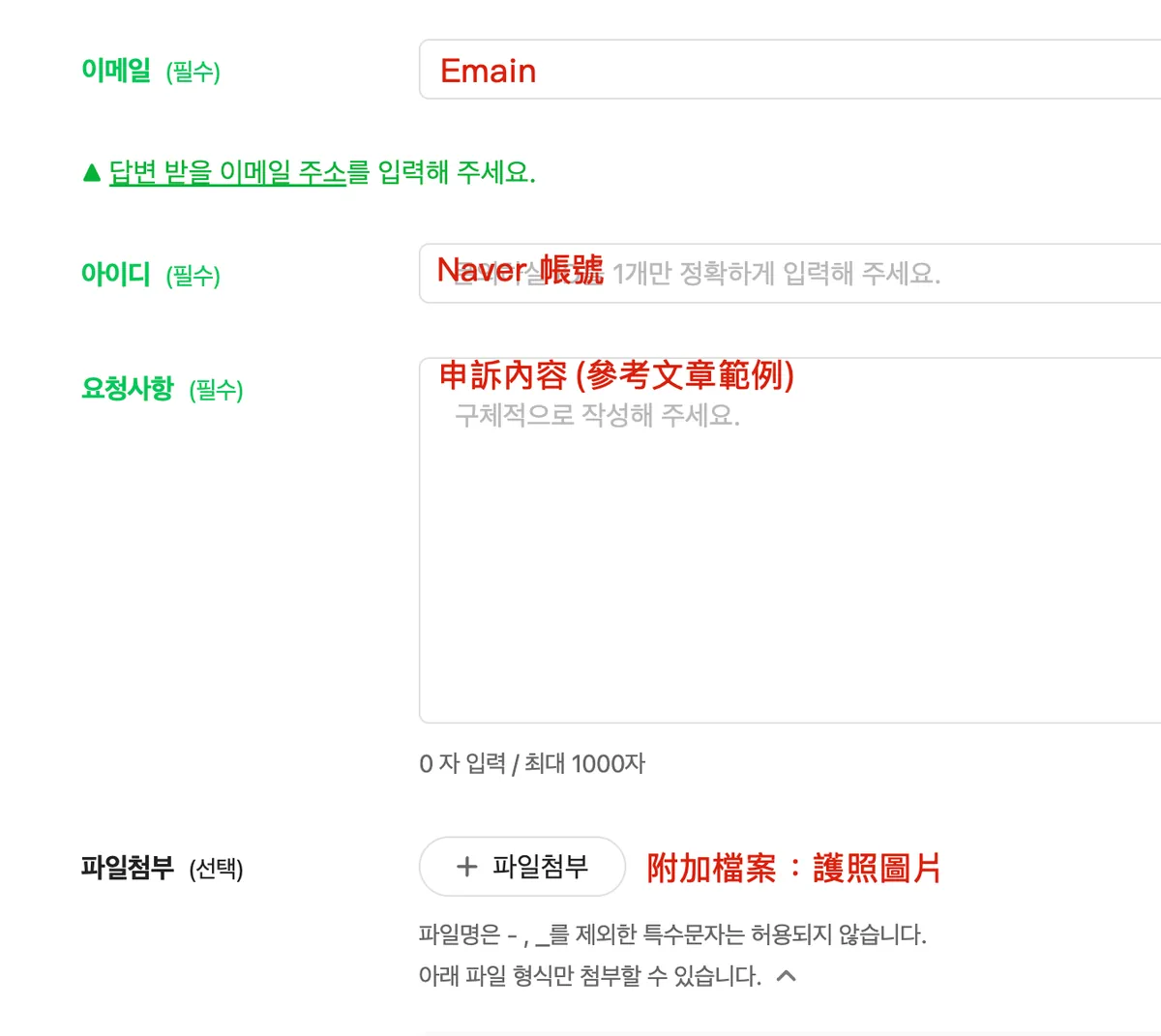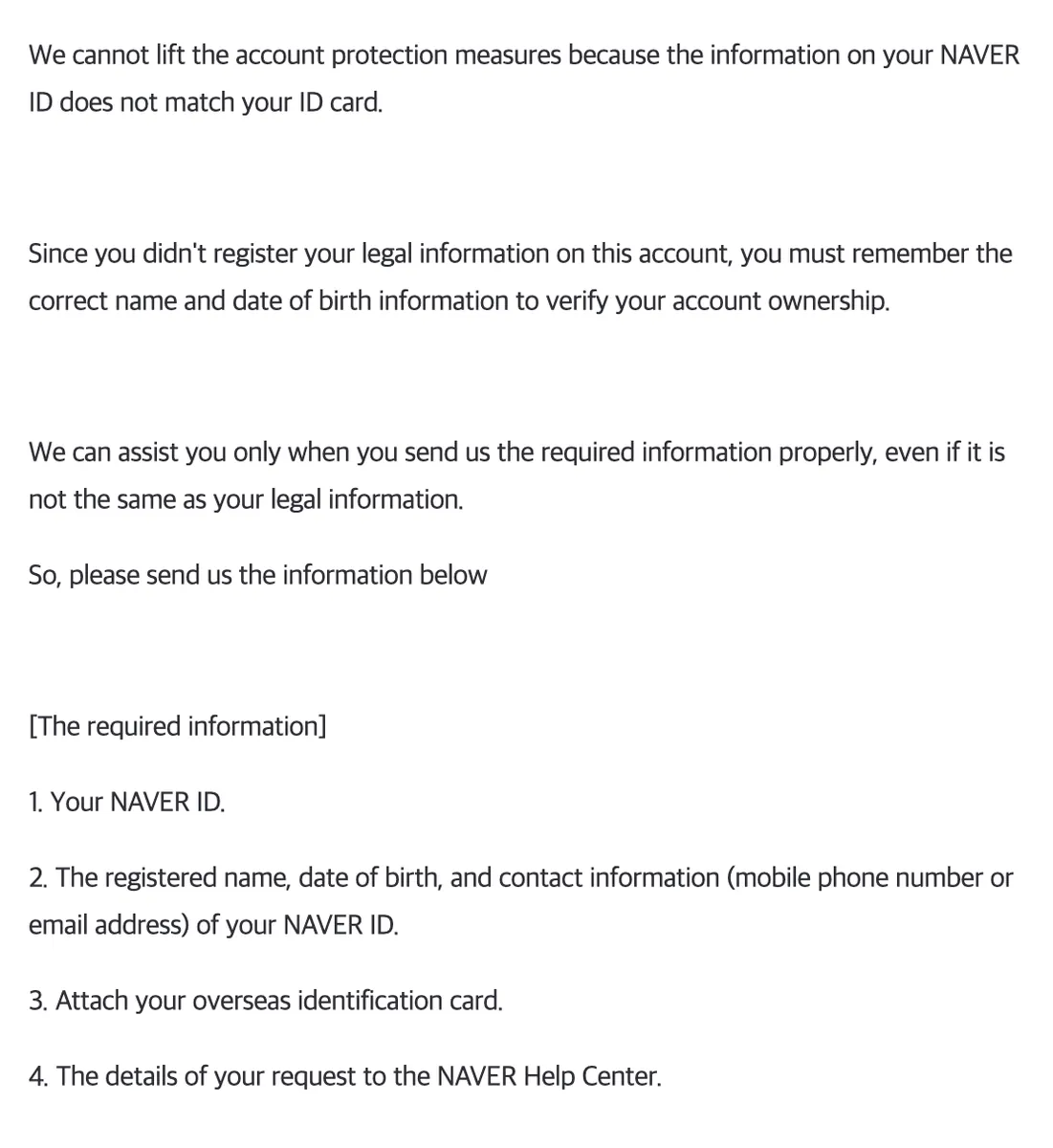 爬 网路资料 说可以填写表单申请取消保护机制「 Members residing outside of Korea_Request to lift account protection measures 」,但是我不太确定名字的问题,因此第一次申请被拒: