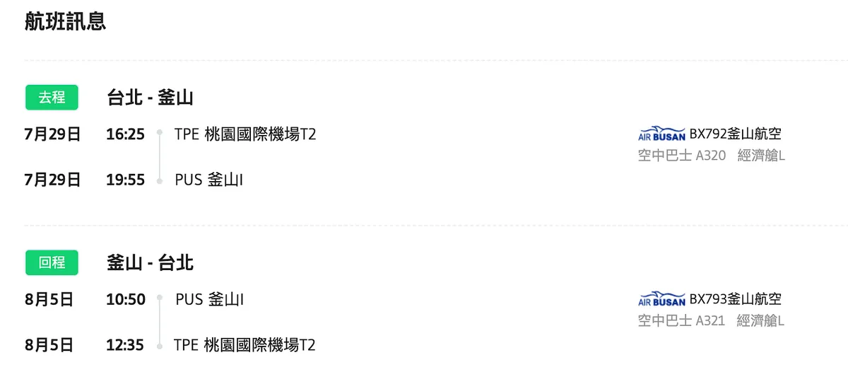 出发:07/29(二) 台北桃园(TPE) 16:25 -> 釜山金海(PUS) 19:55