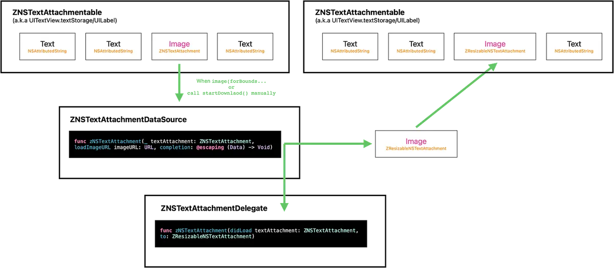 replace(attachment: ZNSTextAttachment, to: ZResizableNSTextAttachment)方法,将ZNSTextAttachment位置替换为ZResizableNSTextAttachment发出 didLoad Delegate 通知,让外部有需要时可串接