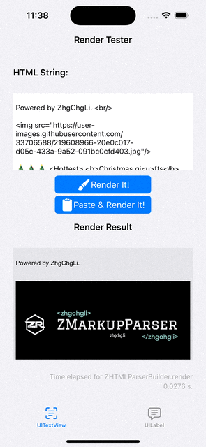 可直接 git clone 专案 后,打开 ZMarkupParser.xcworkspace Project 选择 ZMarkupParser-Demo Target 直接 Build & Run 起来玩玩。