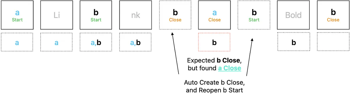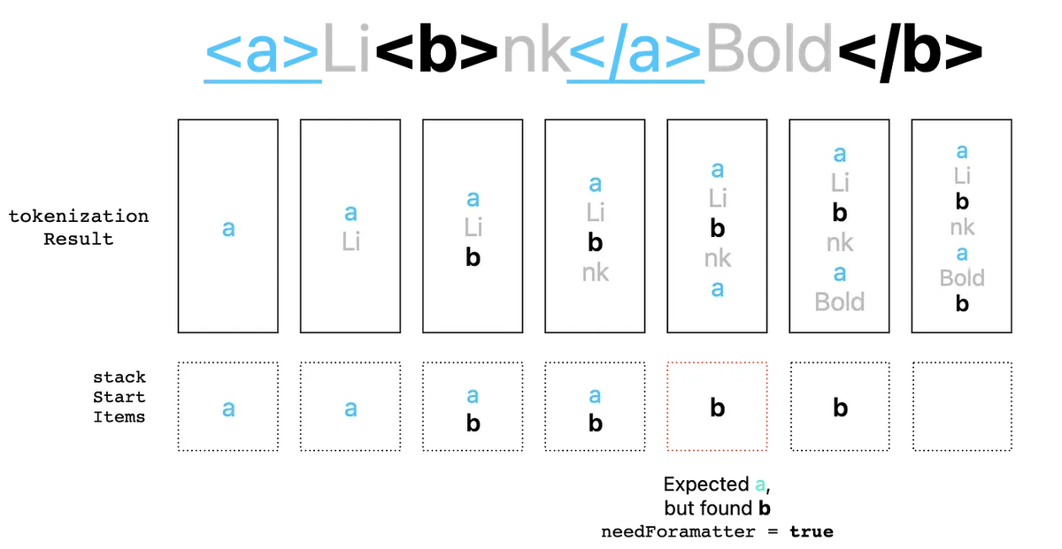 最一开始没想太多,想说可以直接用正则挖出「成对」的 HTML Tag,再递回往里面一层一层找 HTML Tag,直到结束;但是这样没有办法解决 HTML Tag 可以嵌套,或想支援错位容错的问题,因此我们把策略改成挖成出「单个」 HTML Tag,并记录是 Start Tag, Close Tag or Self-Closing Tag,及其他字串组合成解析结果阵列。