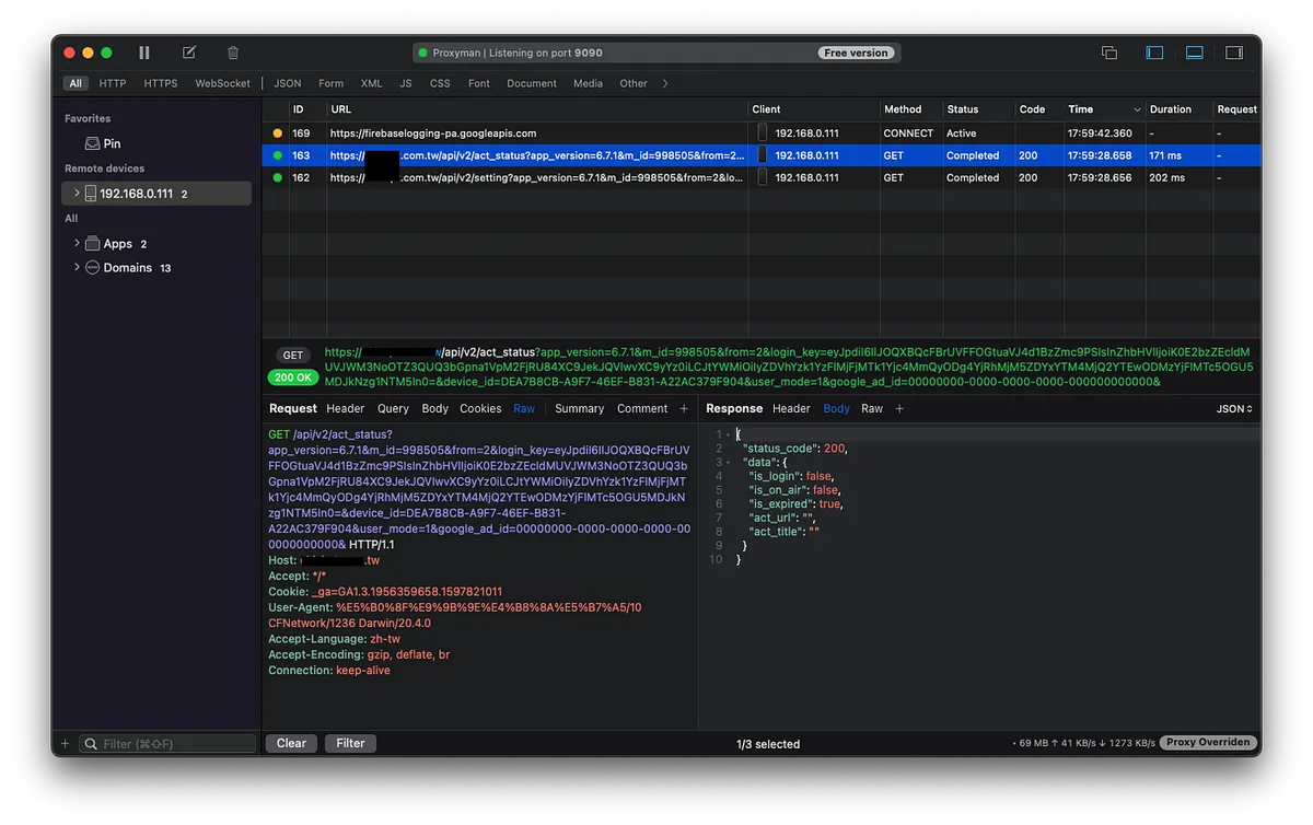万事都从嗅探开始,这部分可参考之前的文章「 APP有用HTTPS传输,但资料还是被偷了。 」、「 使用 Python+Google Cloud Platform+Line Bot 自动执行例行琐事 」第一篇文章看原理建议使用第二篇文章的 Proxyman 进行嗅探。