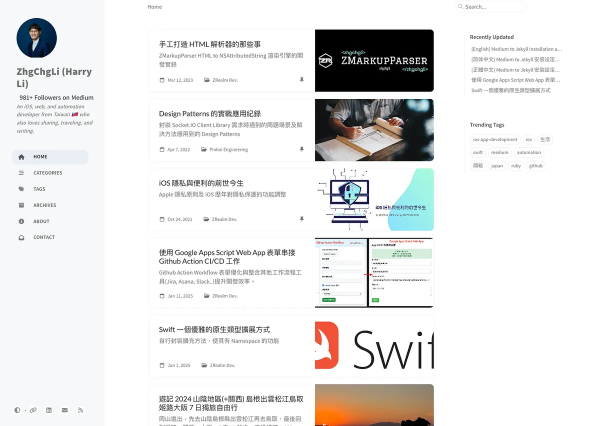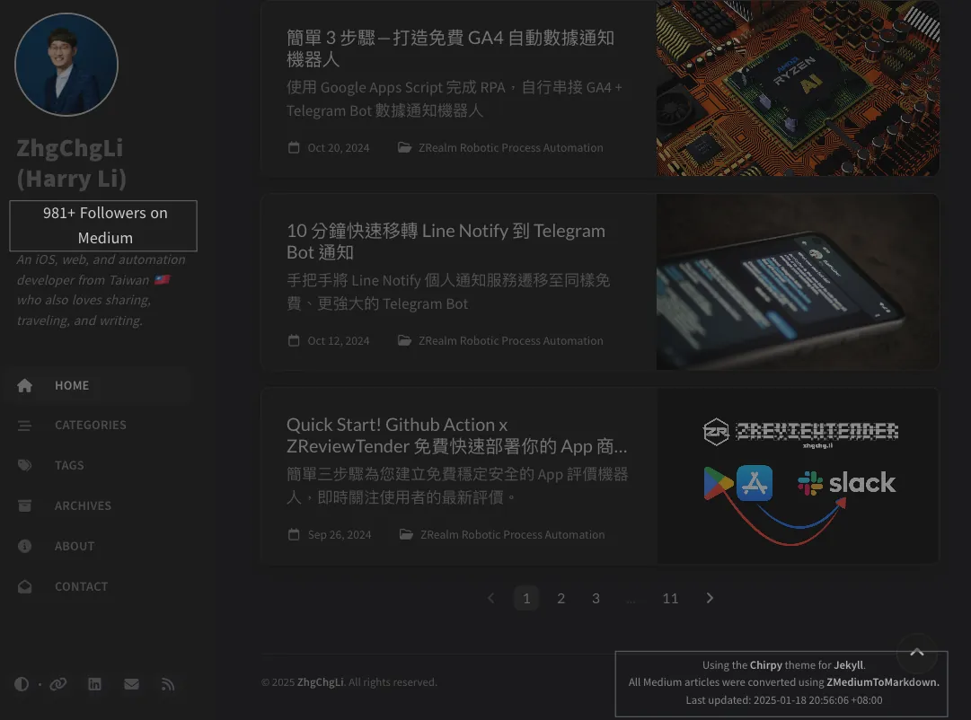 那时候把这整套整合成一个 Github Template Repo 给有同样需求的朋友可以快速部署使用 — ZMediumToJekyll ,在此之后(2022),我就没有再更新过 Jekyll (Chirpy Theme) 的版本跟设定了; ZMediumToMarkdown 持续有在维护,偶尔会发现格式解析错误就会立刻修正,目前趋于稳定。
