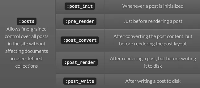 第二种方式是使用 Plugin 中的 Hook 方法,在 Jekyll 产生静态内容阶段注入自己想要的客制化内容。