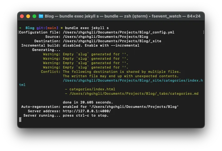 储存后可以先在本机下 bundle exec jekyll s 测试结果: