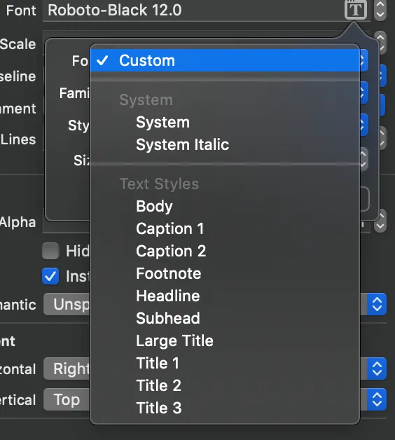 可直接套用系统的Text Styles,或使用Custom(但这边我测试使用Custom无法设定字体大小);所以 我是使用System 自订各显示Label的字体大小