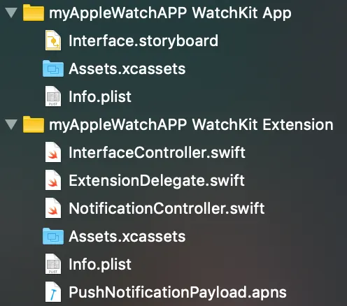 WatchKit Extension: 负责程式呼叫、逻辑处理( * .swift) /InterfaceController.swift:预设的视图控制器程式 /ExtensionDelegate.swift:类似Swift的AppDelegate,Apple Watch App 启动入口 /NotificationController.swift:用于处理Apple Watch App上的推播显示 /Assets.xcassets:这里不使用,我统一放在WatchKit App的Assets.xcassets下 /info.plist:同 iOS,WatchKit Extension 相关设定 /PushNotificationPayload.apns:推播资料,可用在模拟器上测试推播功能