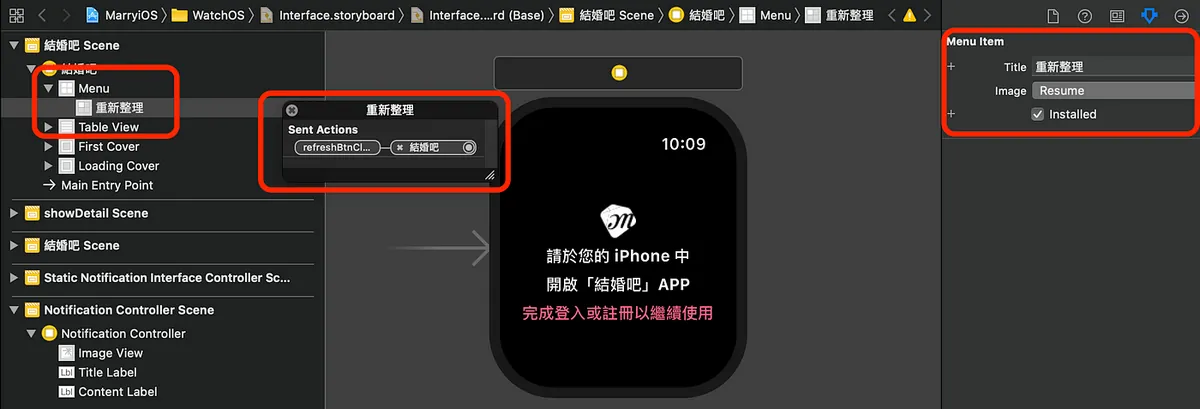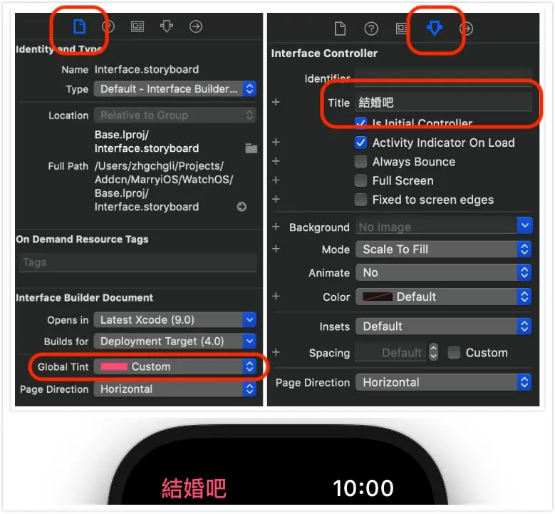 WatchKit App: 负责存放资源、UI显示 /Interface.storyboard:同 iOS,里面有系统预设建立的视图控制器 /Assets.xcassets:同 iOS,存放用到的资源项目 /info.plist:同 iOS,WatchKit App 相关设定