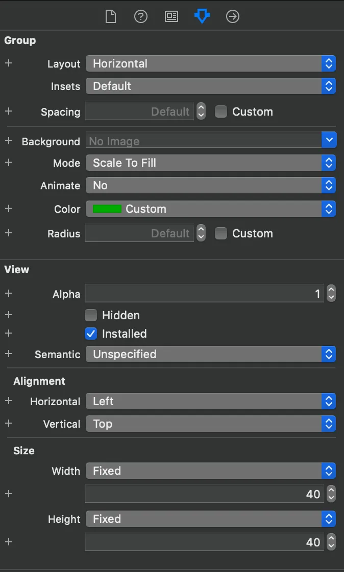 Size/Width:设置Group的大小,有三种模式可选「Fixed:指定宽度」、「Size To Fit Content:依照内容子View大小决定宽度」、「Relative to Container:参照外层包覆的View大小为宽度(可设%/+ -修正值)」