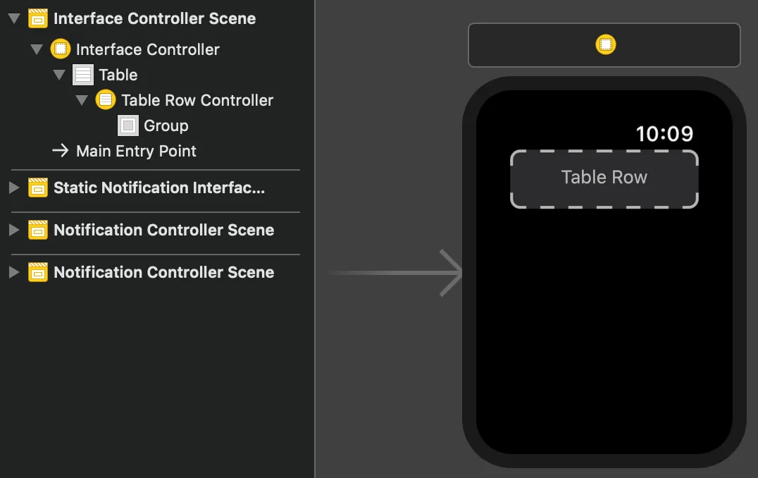 1.整个页面,相当于 iOS App 开发中会使用到的 UITableView,在Apple Watch App 中简化了操作,名字也改叫做「WKInterfaceTable」 首先就先拉一个Table到Interface Controller Scence中