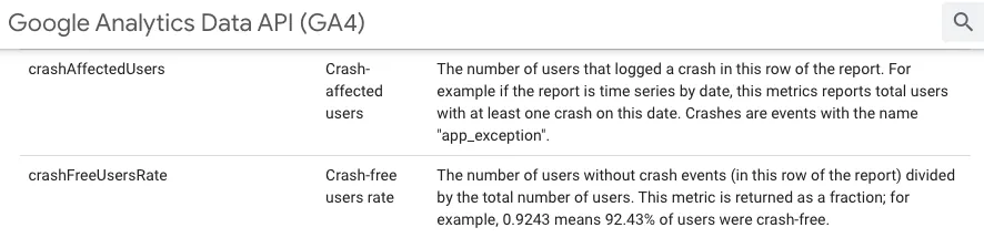 一开始我以为这个数据同样能从 Big Query 查询出来;但其实这方向完全错误,因为 Big Query 是 Crash 的 Raw Data,不会有没有闪退的人的数据,因此也算不出 Crash-Free Users Rate;关于这个需求在网路上的资料不多,查询许久才找到有人提到 Google Analytics 这个关键字;我知道 Firebase 的 Analytics、Event 都能串到 GA 查询使用,但没想到 Crash-Free Users Rate 这个数据也包含在内,翻阅了 GA 的 API 后,Bingo!